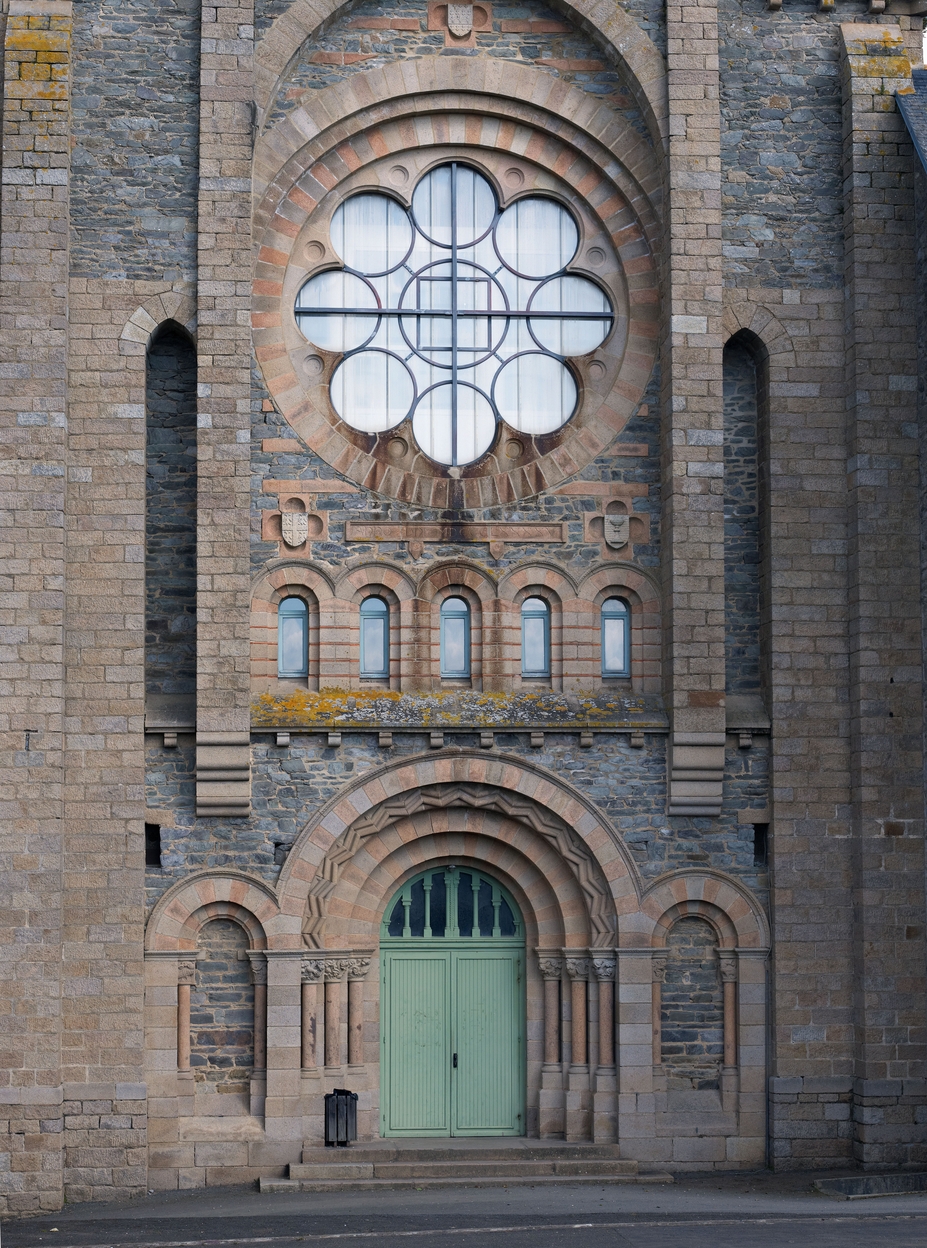 Tréguier : petit séminaire actuellement lycée Joseph Savina, chapelle, détail de l'élévation ouest, grande rosace et porcheImmatriculation