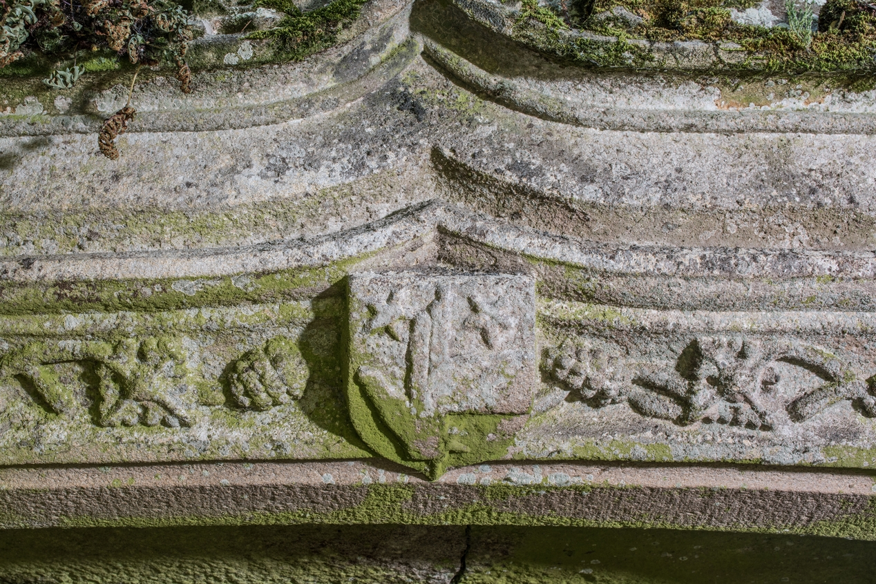 Le château : vue intérieure, entrée de l'escalier, blason d'alliance entre les familles Marot et FerréImmatriculation