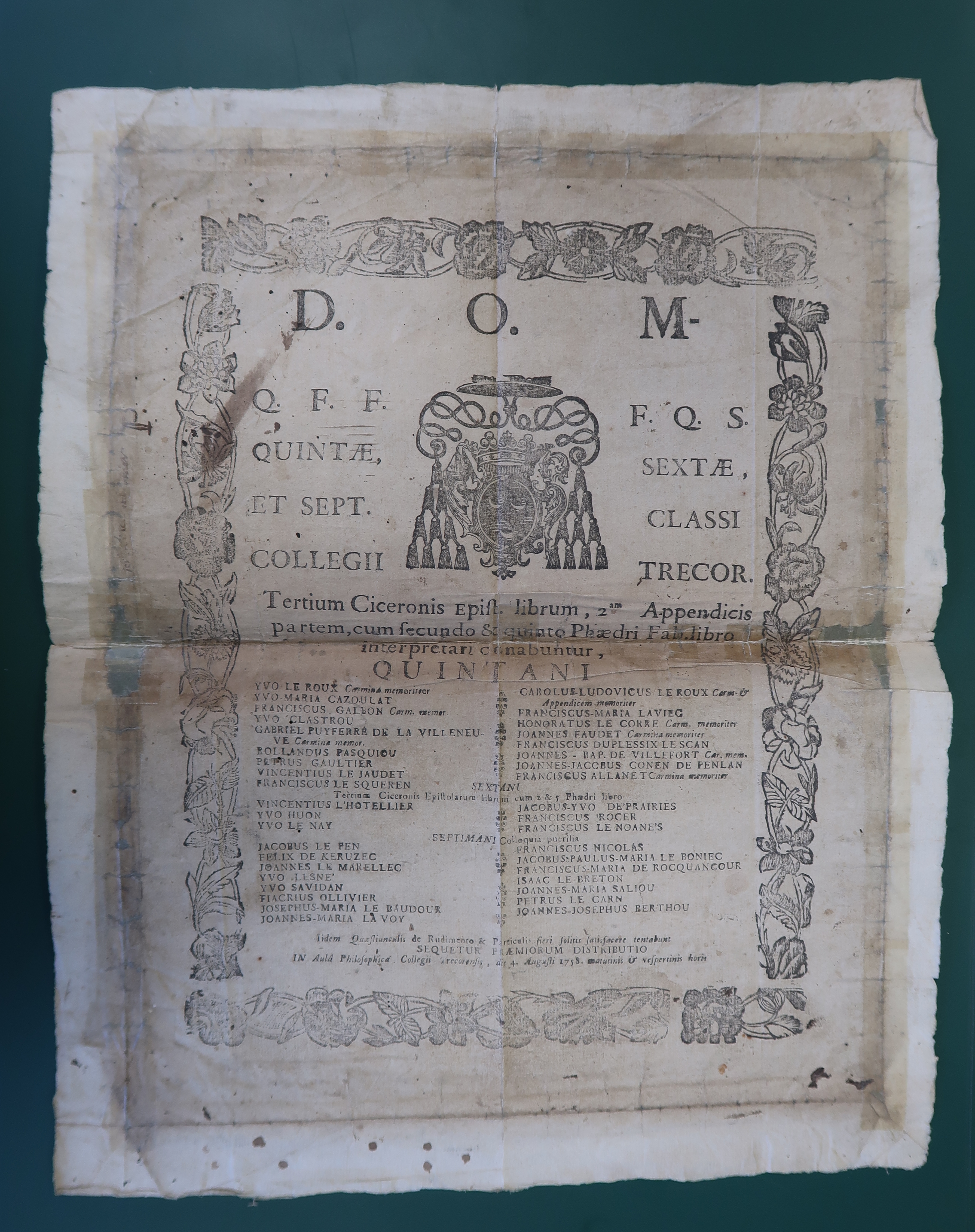 Tréguier : remise des prix du Collegii Trecorensis (collège de Tréguier dit collège diocésain), 4 août 1758 (Collection de la bibliothèque du collège Saint-Joseph de Lannion)Immatriculation