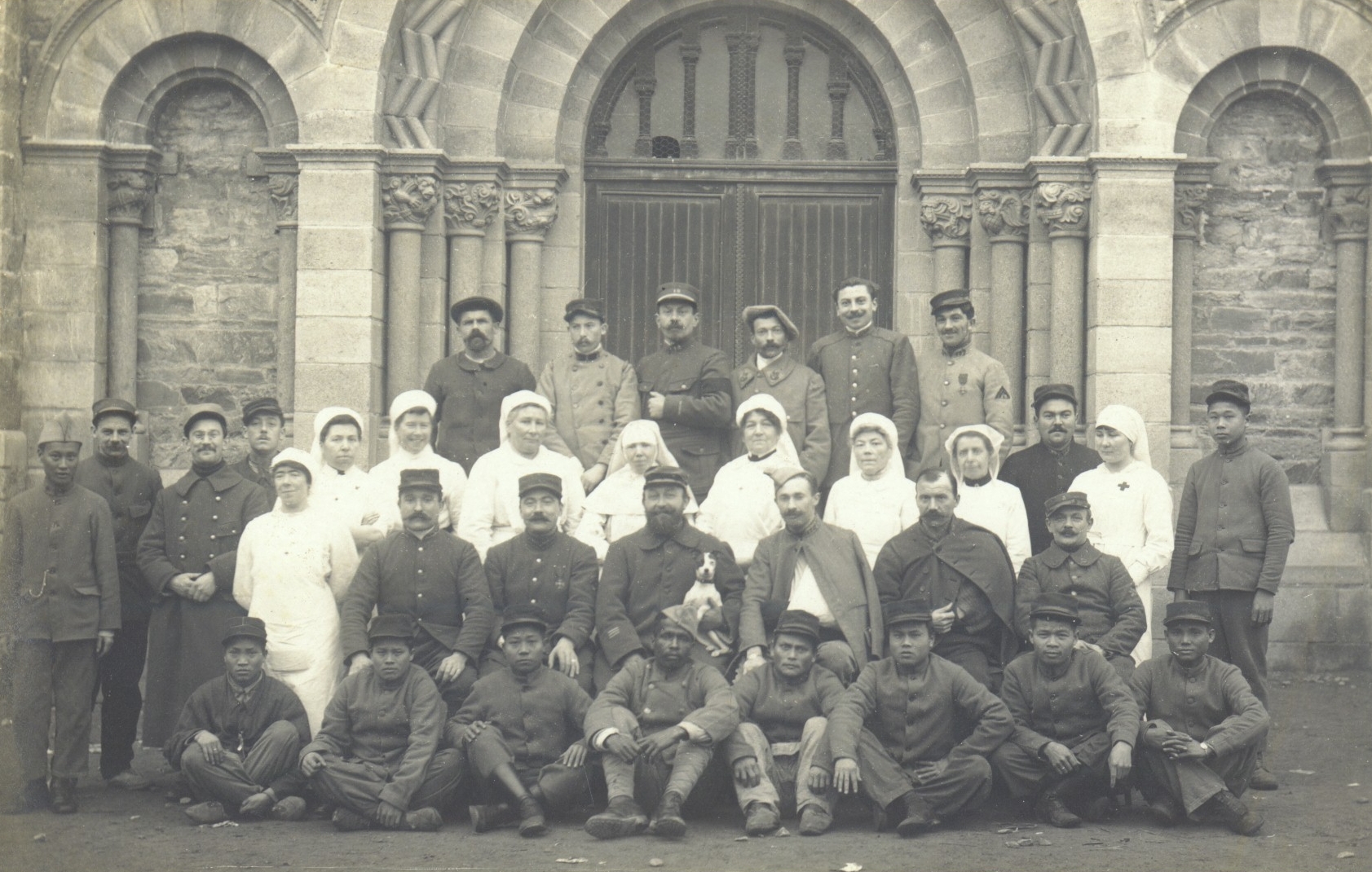 Tréguier : petit séminaire, soldats et infirmières de l'hôpital complémentaire devant le porche de la chapelle ouest, vers 1914-1918 (collection iconographique réunie par Michel Le Cam, ancien professeur au Lycée Joseph Savina)Immatriculation