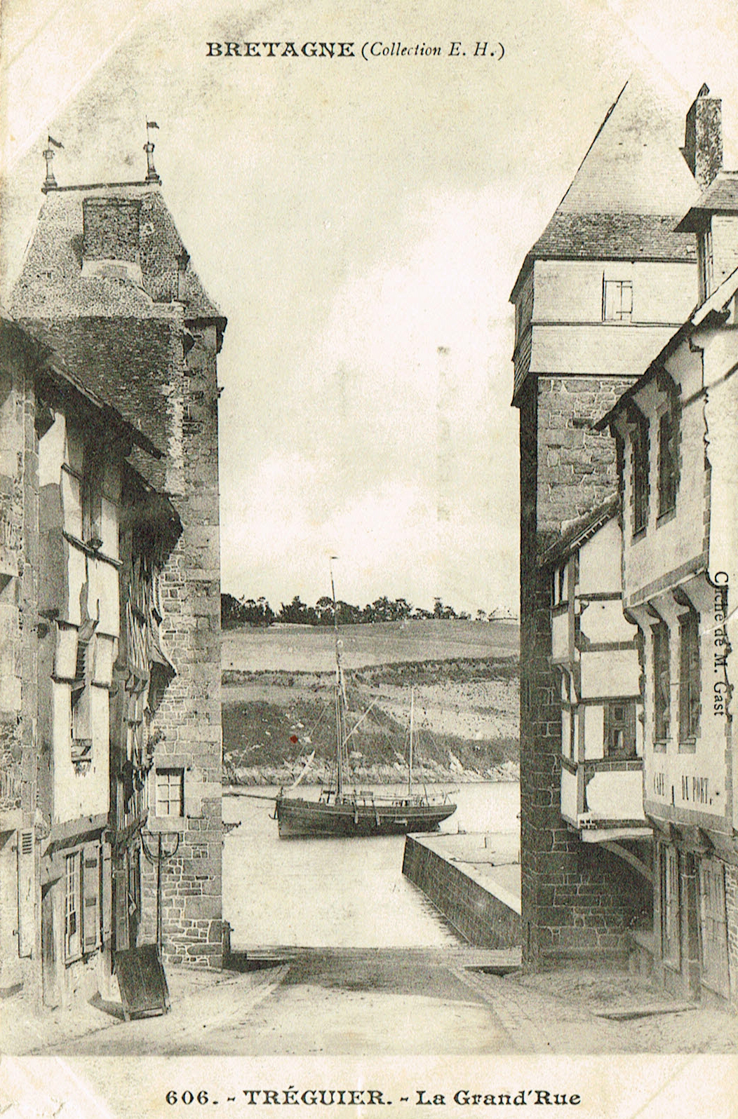 Tréguier : maisons d'armateur ou de négociant du bas de la rue Renan (ex "Grande rue"), carte postale (collection particulière). Dans l'alignement de la rue, le quaiImmatriculation