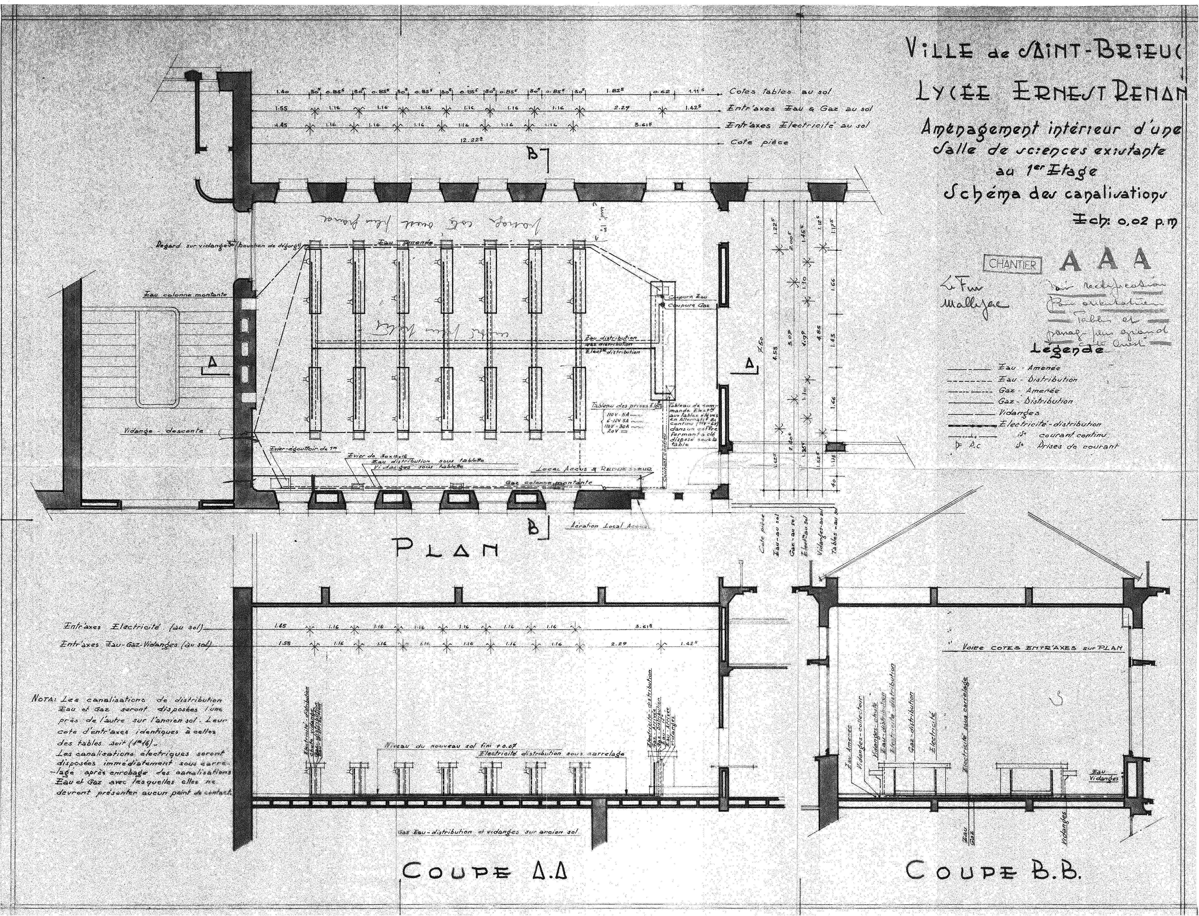 Aménagement intérieur d'une salle de sciences existante au 1er étage. Schéma des canalisations. SN-SD (document classé dans le fonds Jean-Fauny, 1957- , des AD22)Immatriculation
