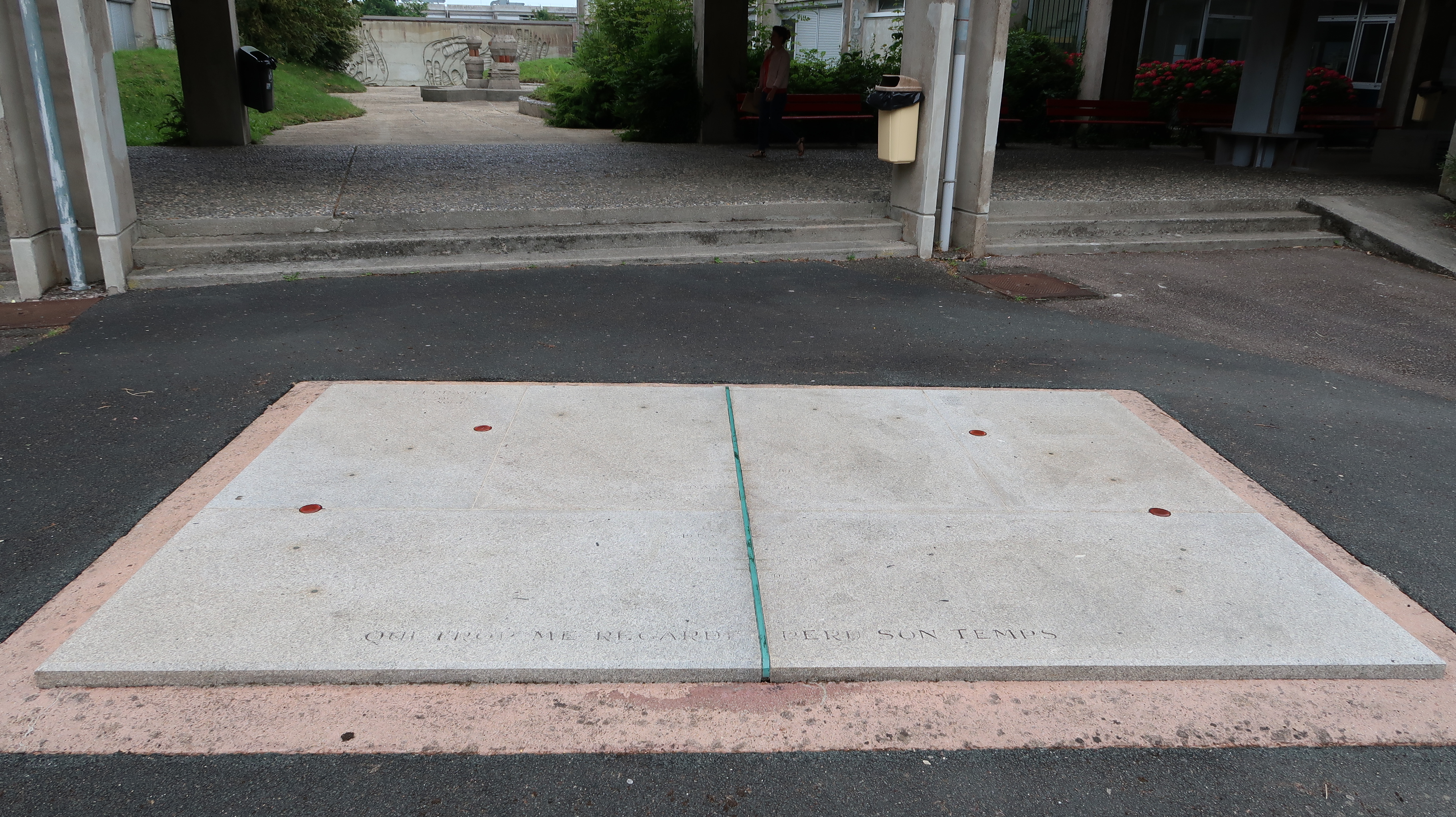 Décoration du lycée : stèle avec mention "Qui trop me regarde perd son temps".Immatriculation