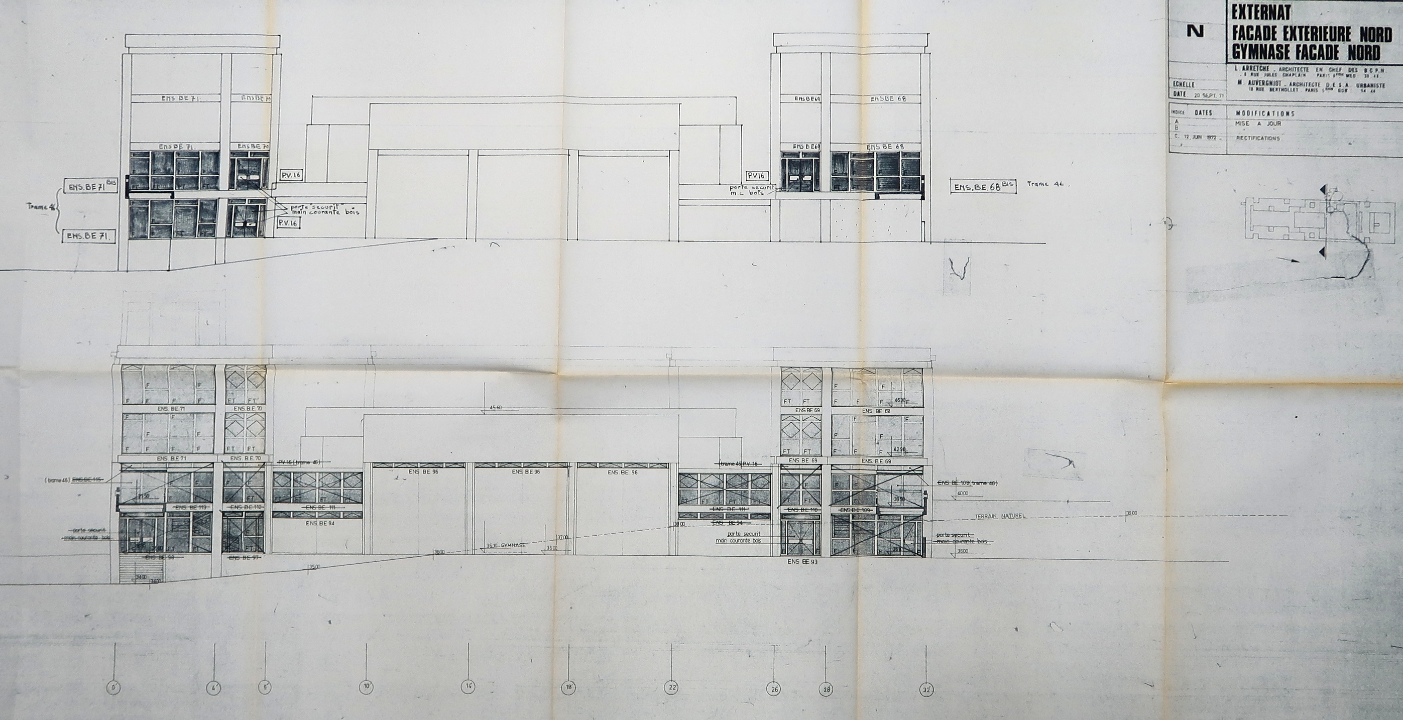 Externat, façade extérieure nord. Gymnase façade nord (1972).Immatriculation