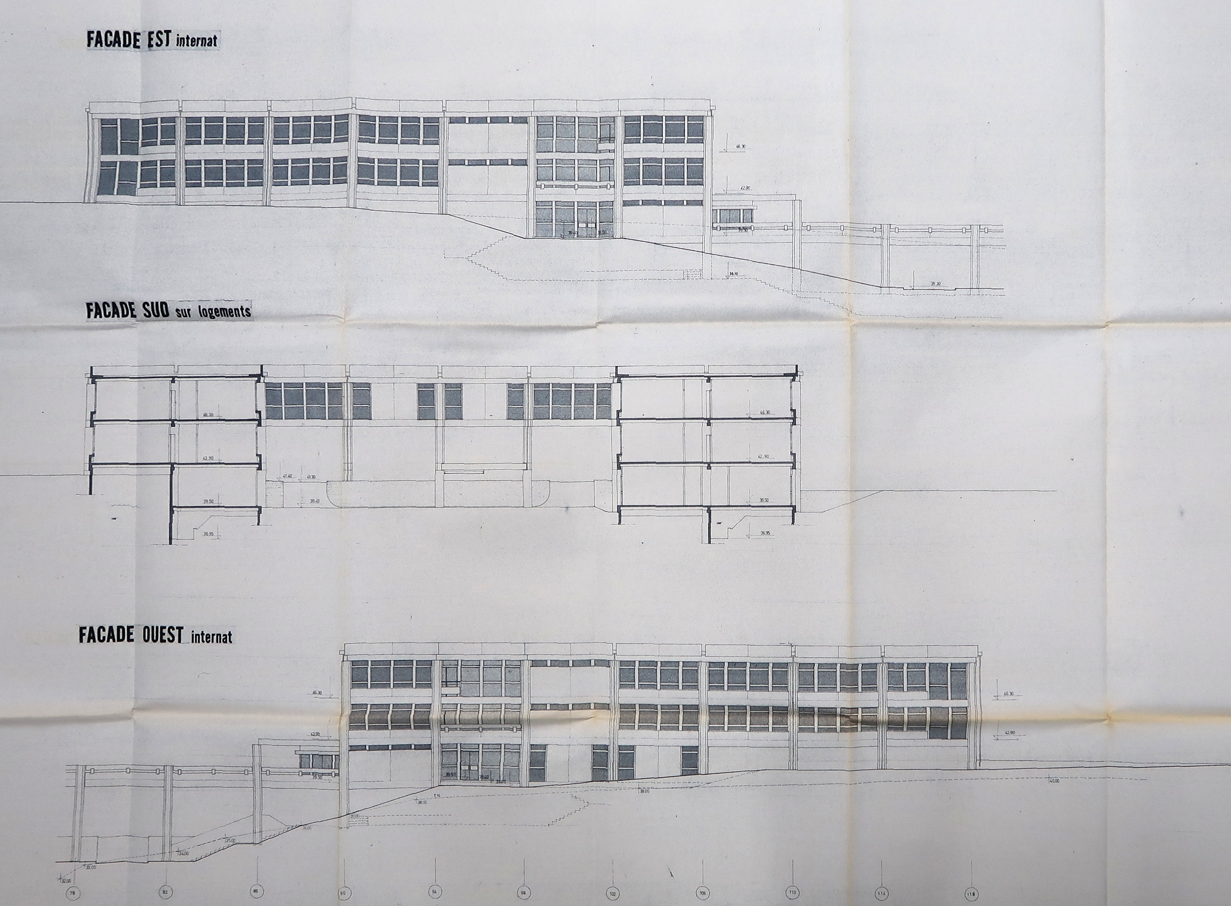 Internat. Façades ouest et est. Façade sud logements.Immatriculation