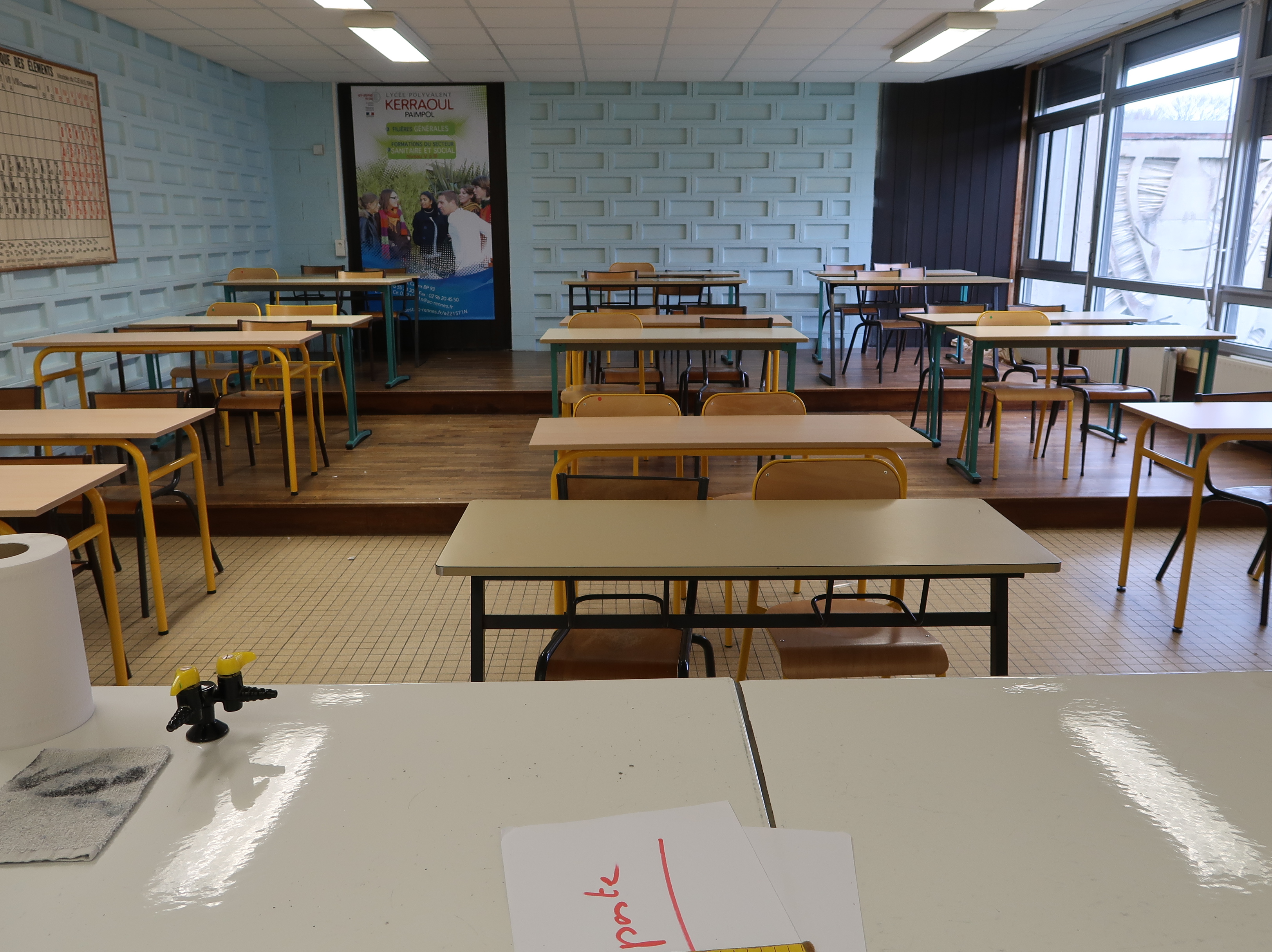 Salle de classe avec estrade, murs en parpaing de ciment faisant aussi fonction d'isolation phonique et vue partielle sur l’œuvre du pignon du gymnase.Immatriculation