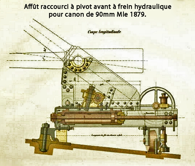 Affût raccourci à pivot avant à frein hydraulique pour canon de 90 mm modèle 1879Immatriculation