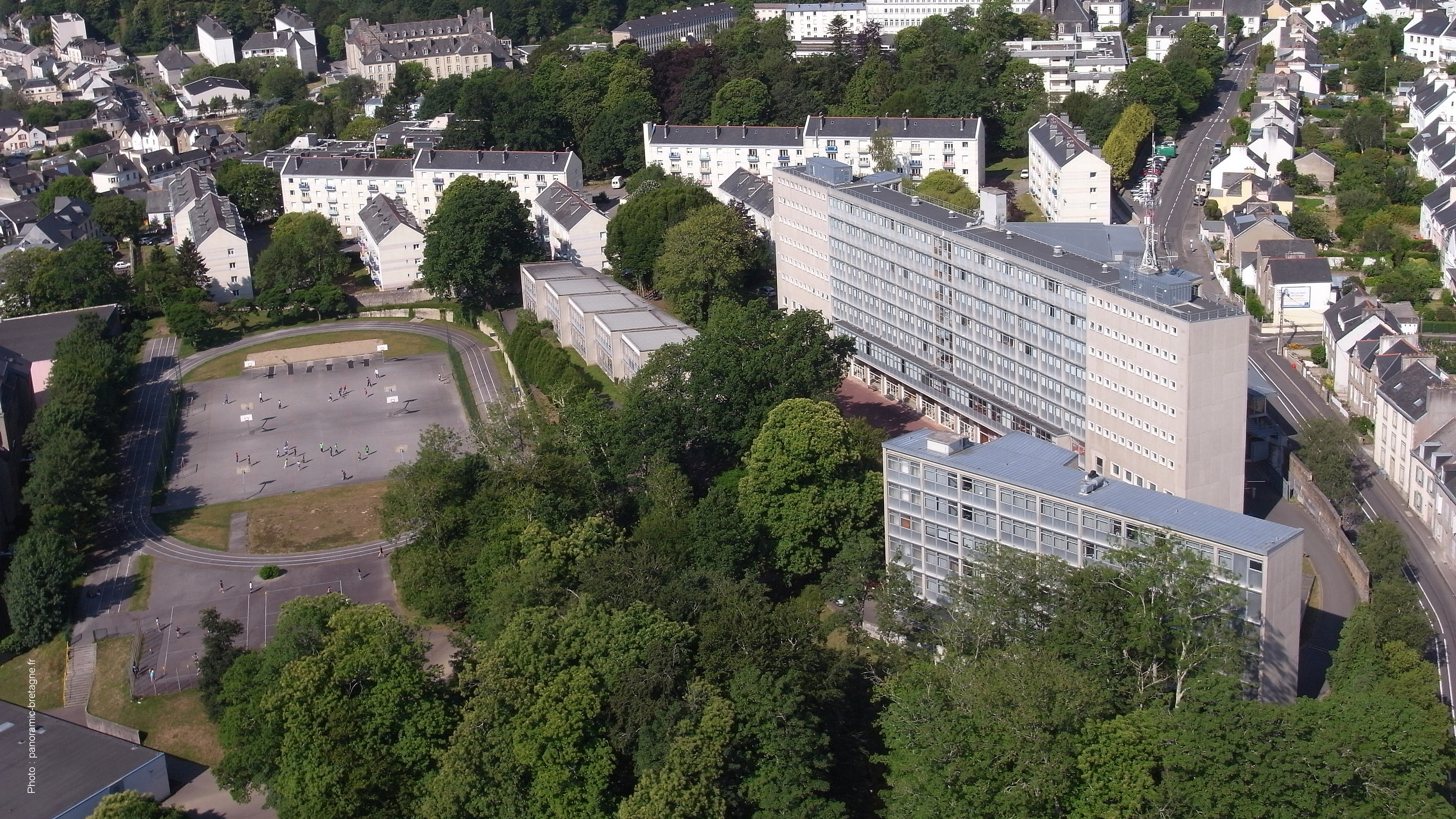 Vue aérienne du lycée Auguste Brizeux : les bâtiments des années 1950 (R. Lopez, architecte)Immatriculation