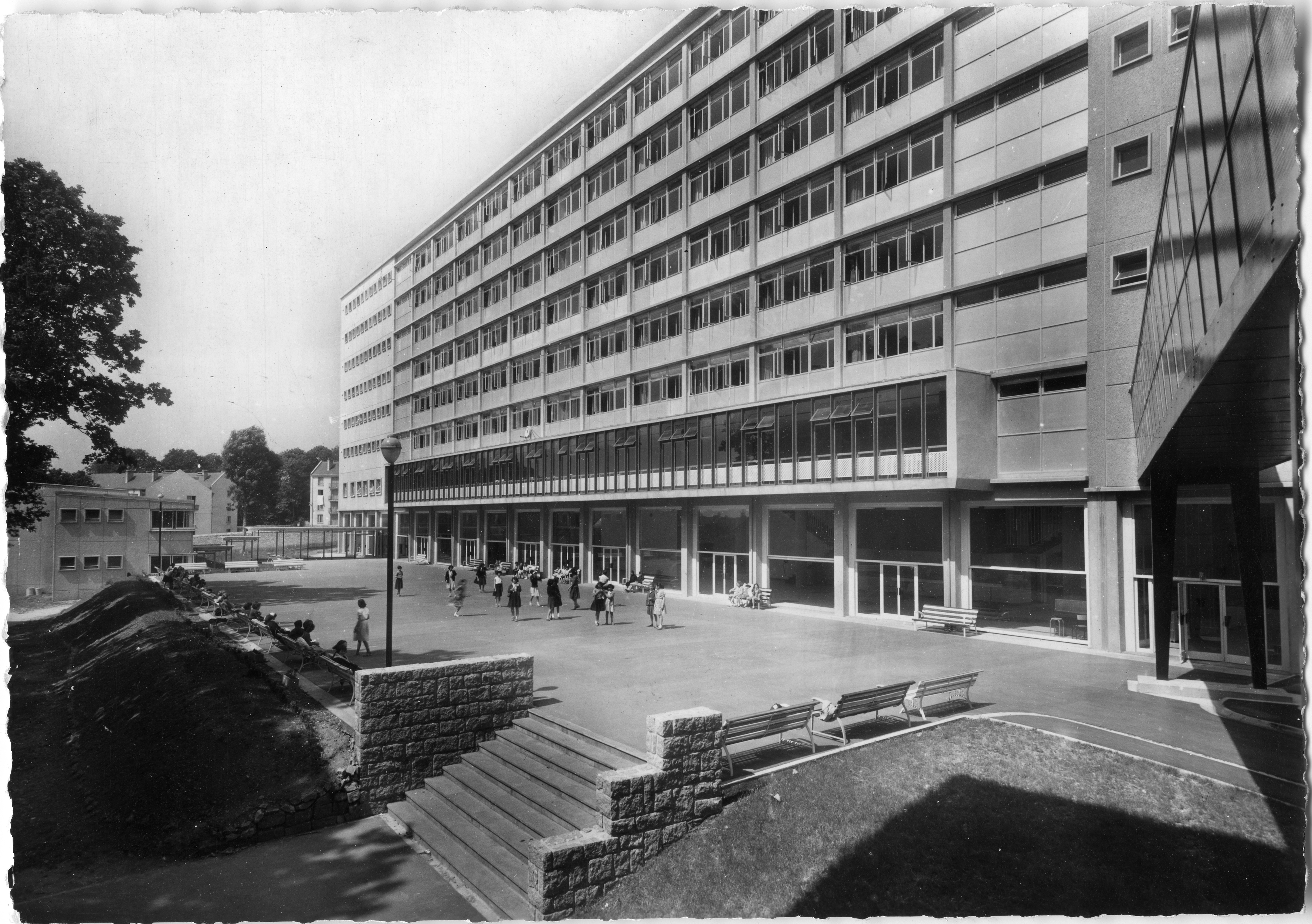 Le plus grand des deux internats construits en 1958 (R. Lopez, architecte) et son parvis : des proportions et une architecture hors normes. Il abrite, au rez-de-chaussée, des "foyers" d'élèves et au premier étage, le restaurant dont l'encorbellement vitré rythme la façadeImmatriculation