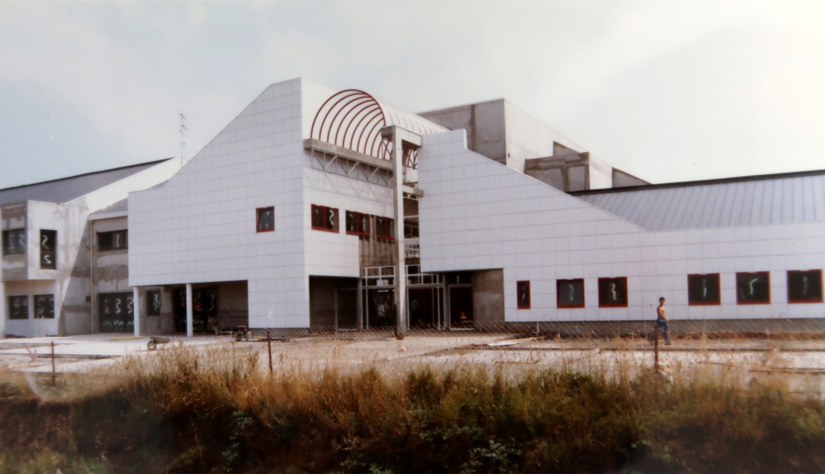 Vue de la façade, côté entrée, pendant a construction.Immatriculation
