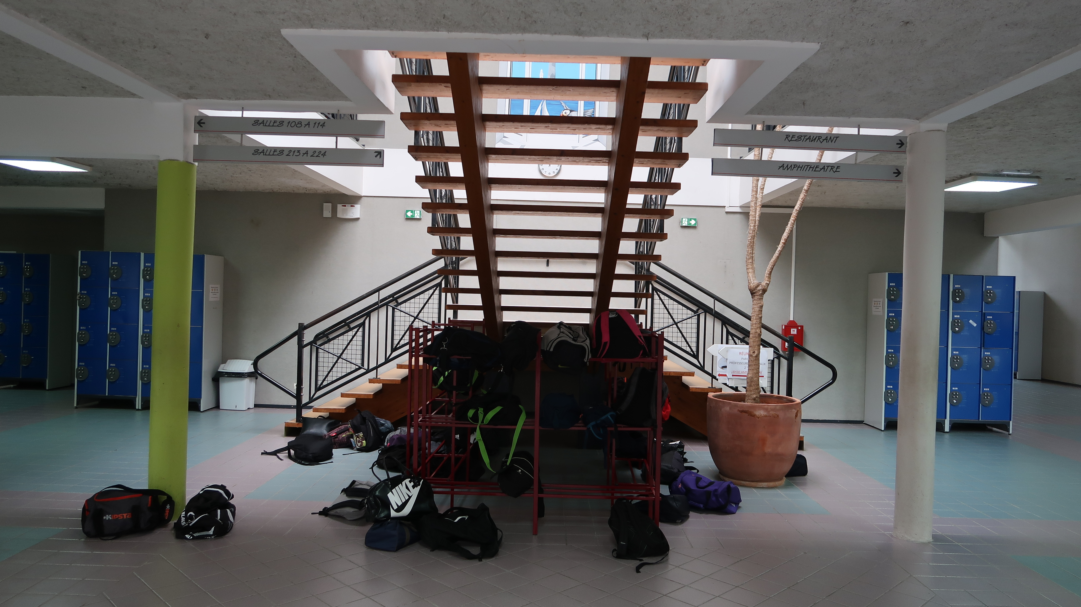 Escalier de desserte de l'étage, situé à l'extrémité de l'axe central, côté sud.Immatriculation