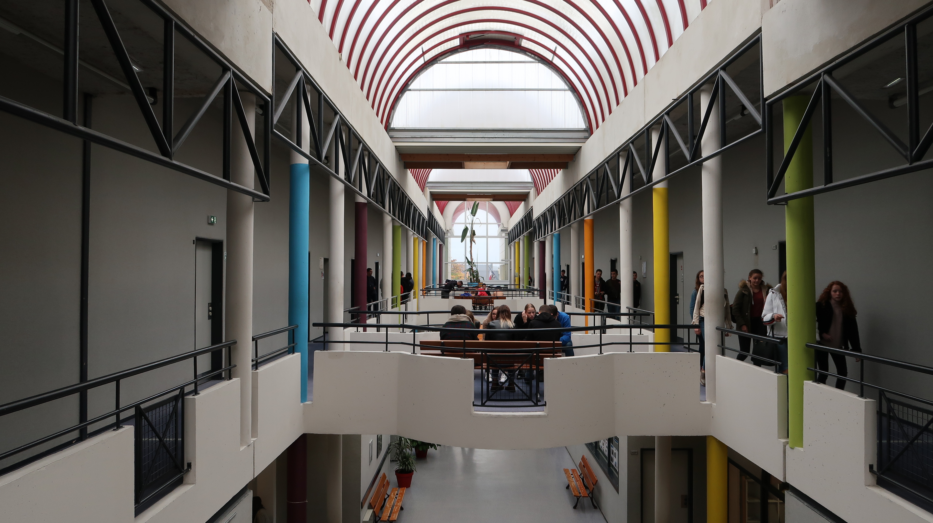L'axe central vu du premier étage, du sud vers le nord. L'esprit mezzanine, pour laisser passer la lumière jusqu'au rez-de-chaussée et les circulations sont très lisibles.Immatriculation