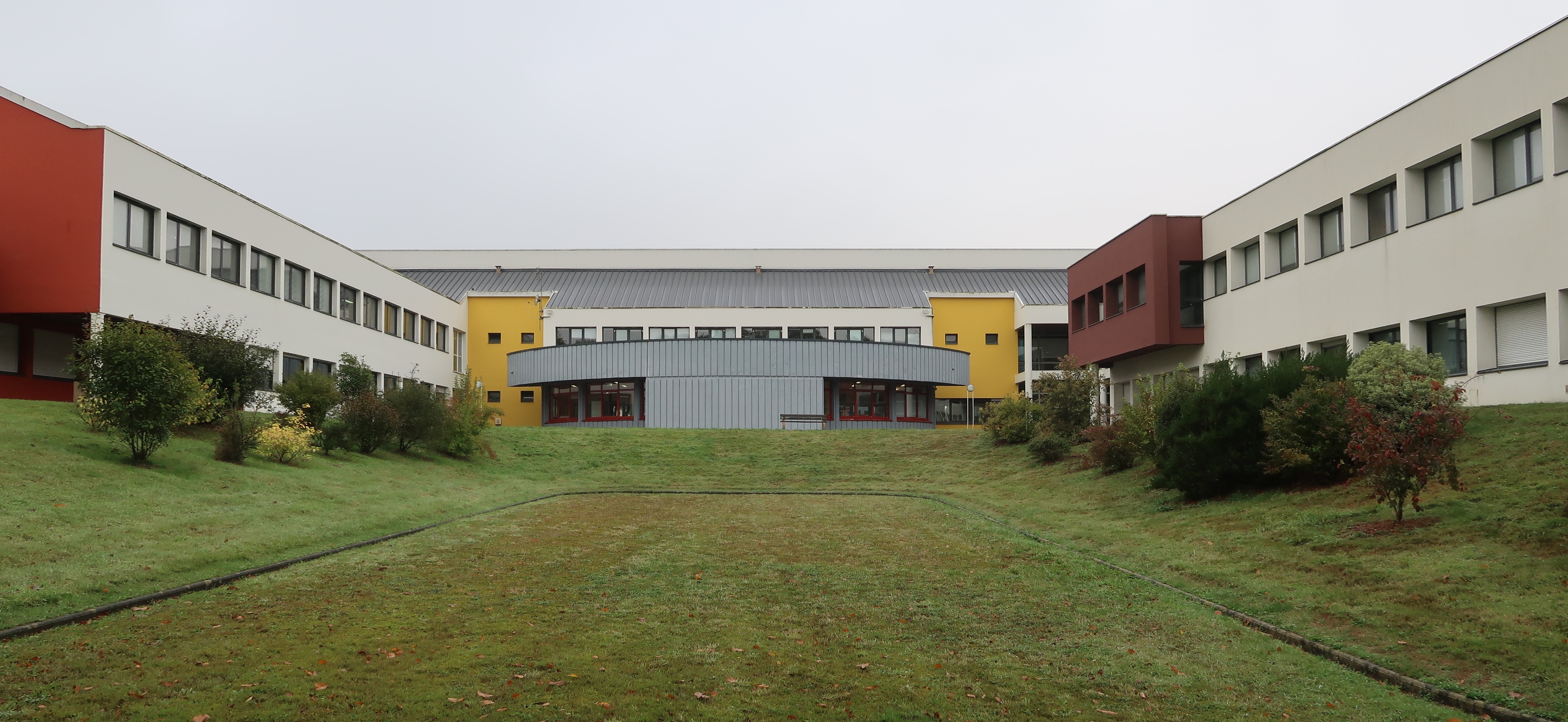 Vue d'ensemble prise depuis l'est. Au centre, le CDI, à gauche, l'aile des matières littéraires, à droite, l'aile des matières scientifiques.Immatriculation