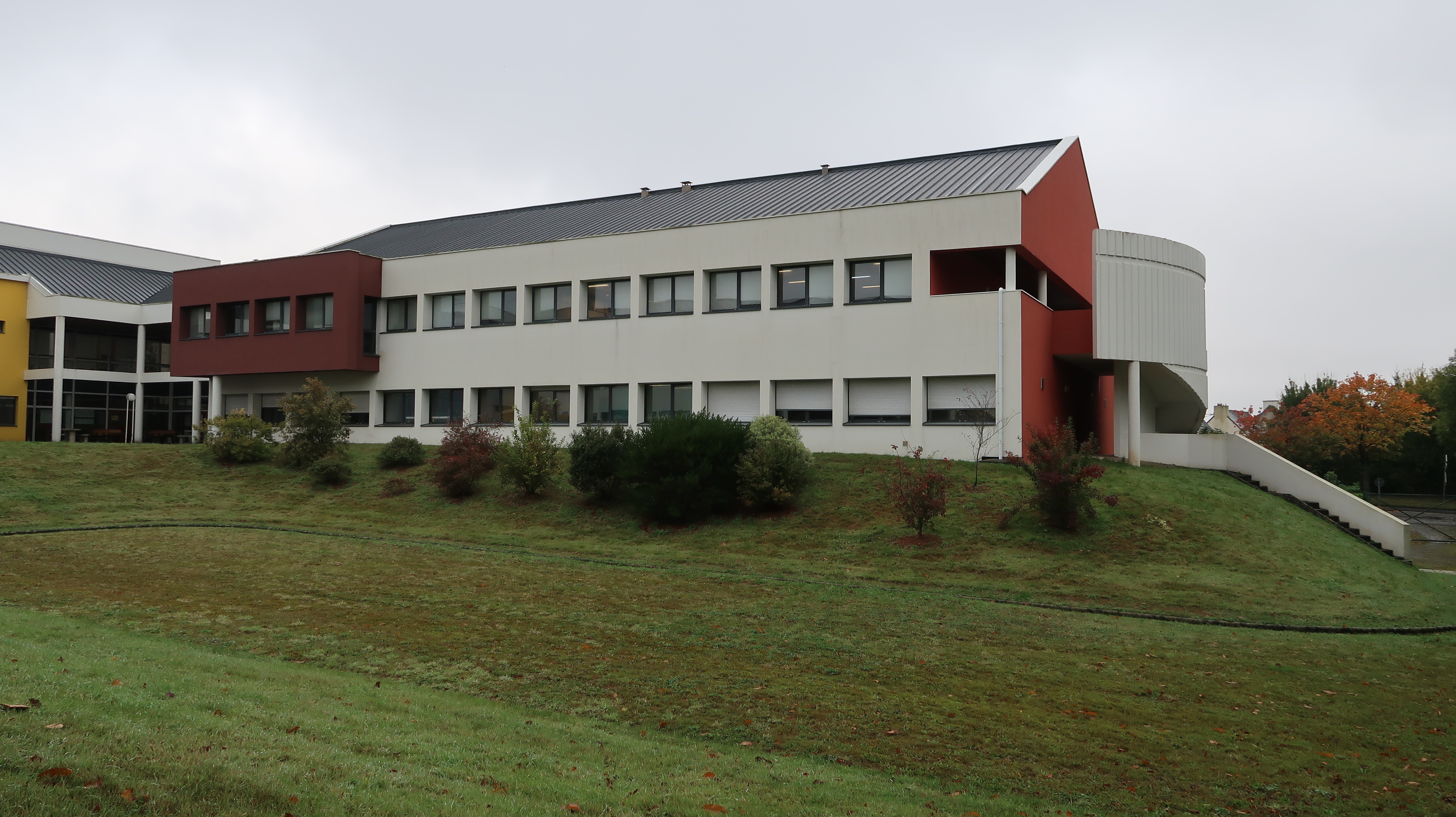 Externat dédié aux matières scientifiques. Noter le vocabulaire architectural utilisé pour rompre avec la blanche linéarité des façades : portique, encorbellement, escalier aux formes curvilignes et aplats de couleur.Immatriculation