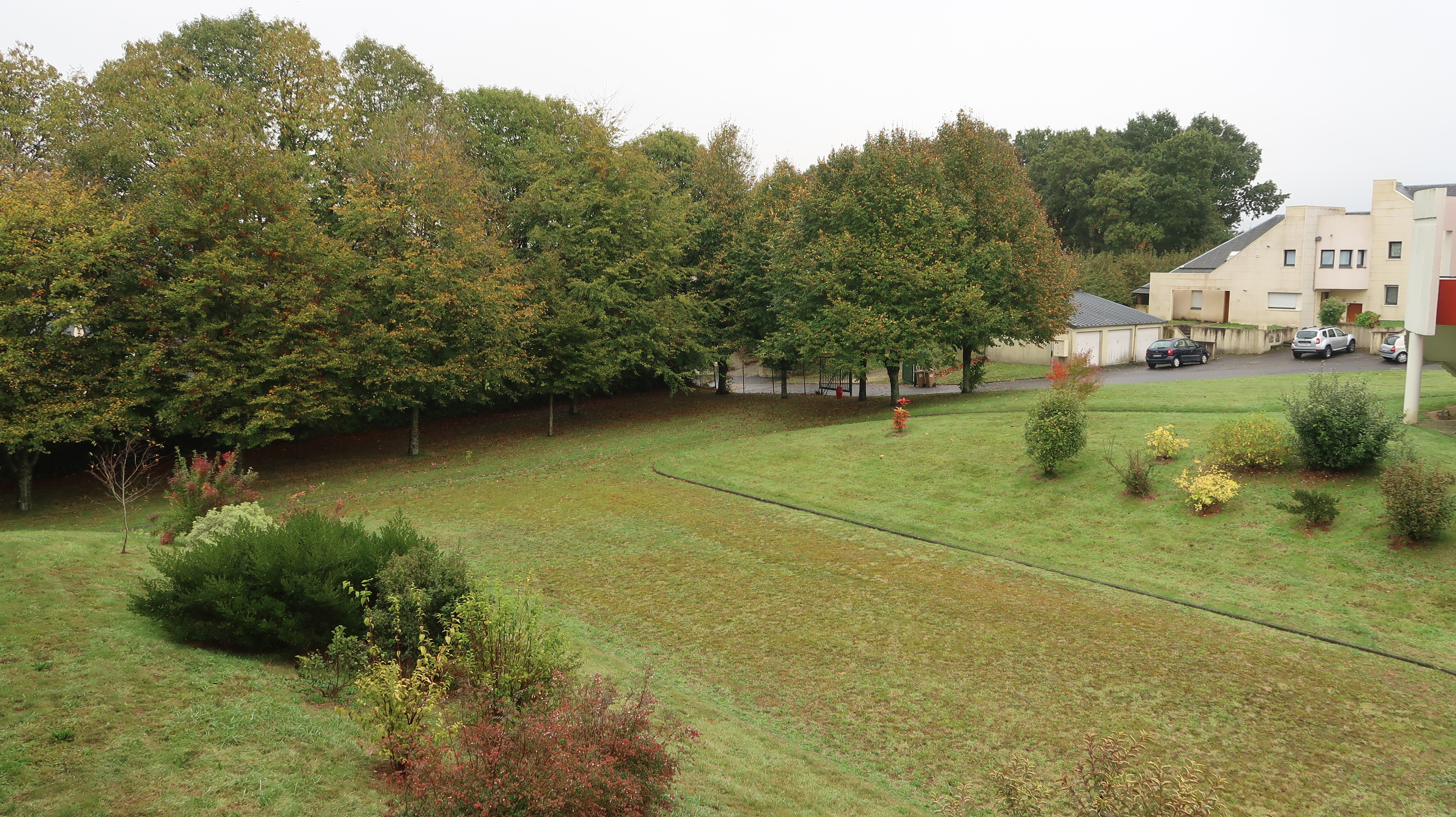 Contexte paysager : rangée d'arbres implantée à l'est, massifs, pelouses... A droite, les logements de fonction.Immatriculation