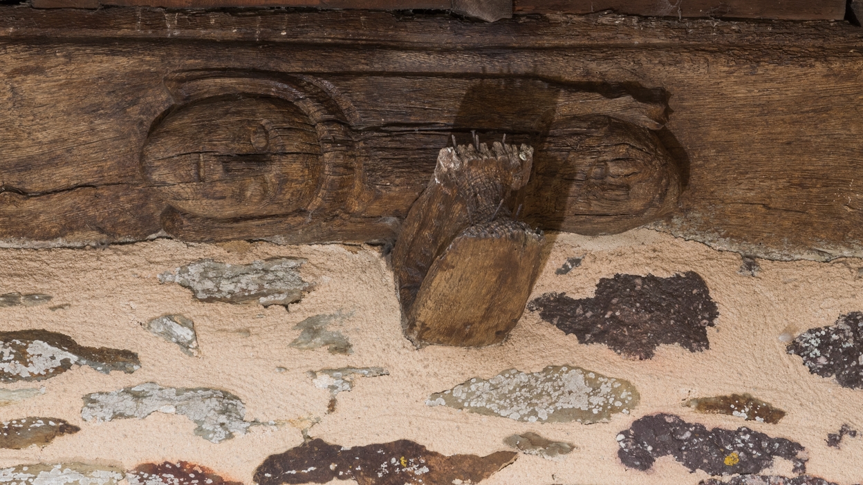 Sablière sculptée extérieure de la façade méridionale (détails de visages)Immatriculation