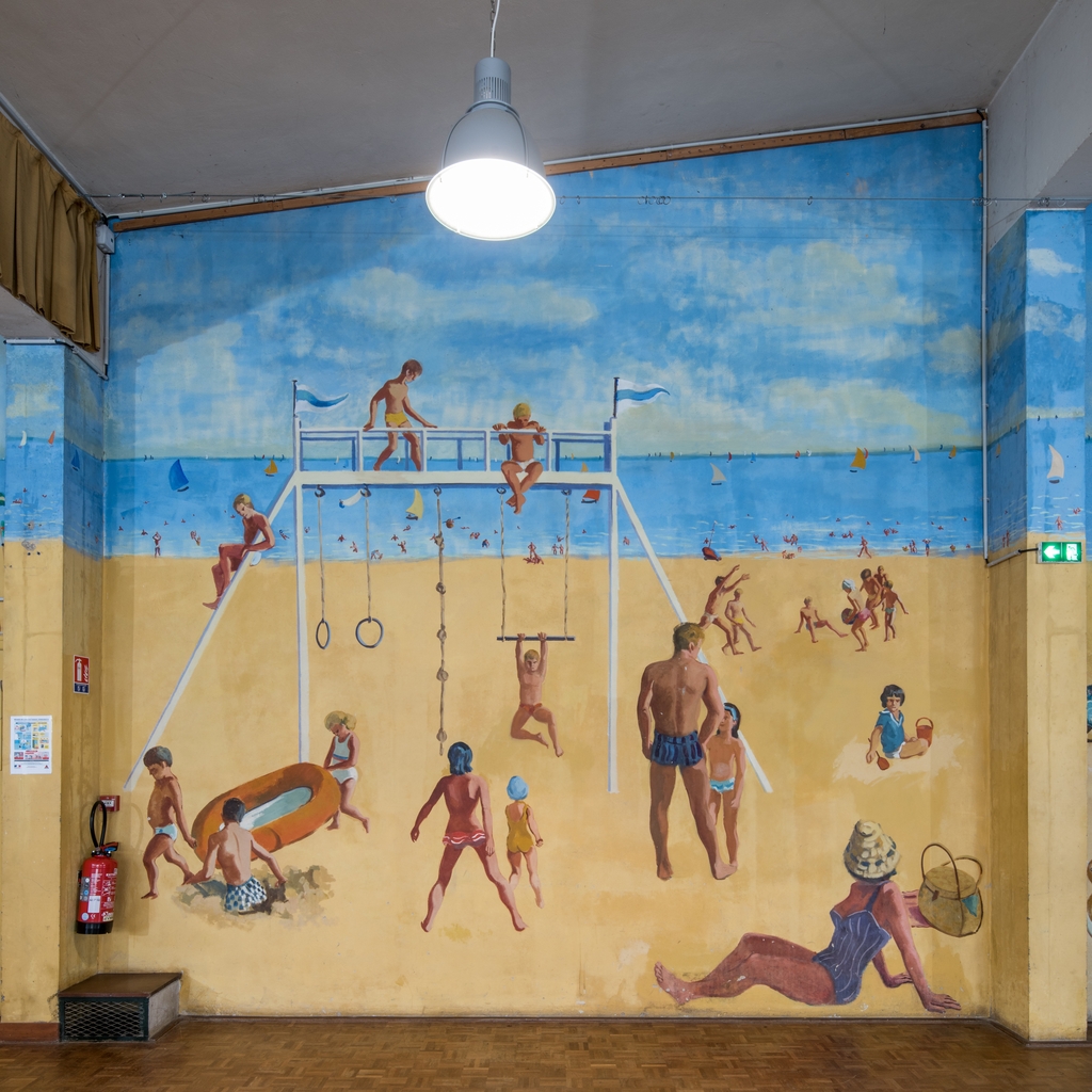 Détail de la peinture murale dans la salle des fêtes, représentant une scène de plage. Edmond Heuzé, 1963.Immatriculation