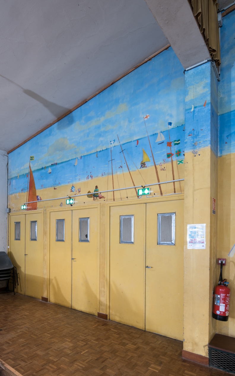 Détail de la peinture murale dans la salle des fêtes, représentant une scène de plage. L'artiste utilise toute la longueur du mur, y compris au-dessus des portes. Edmond Heuzé, 1963.Immatriculation