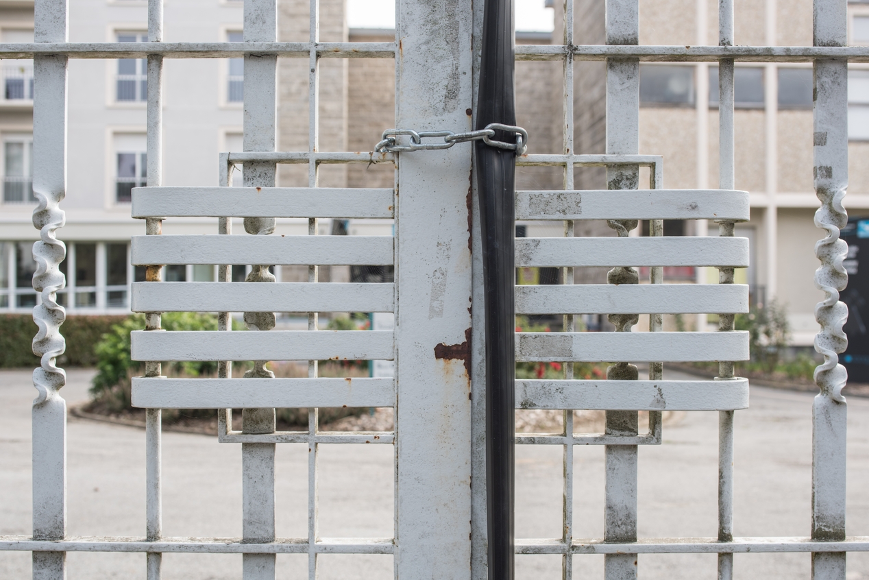 Détail du portail de l'entrée principale (ouest). Ferronnerie d'art, Raymond Subes, 1968.Immatriculation