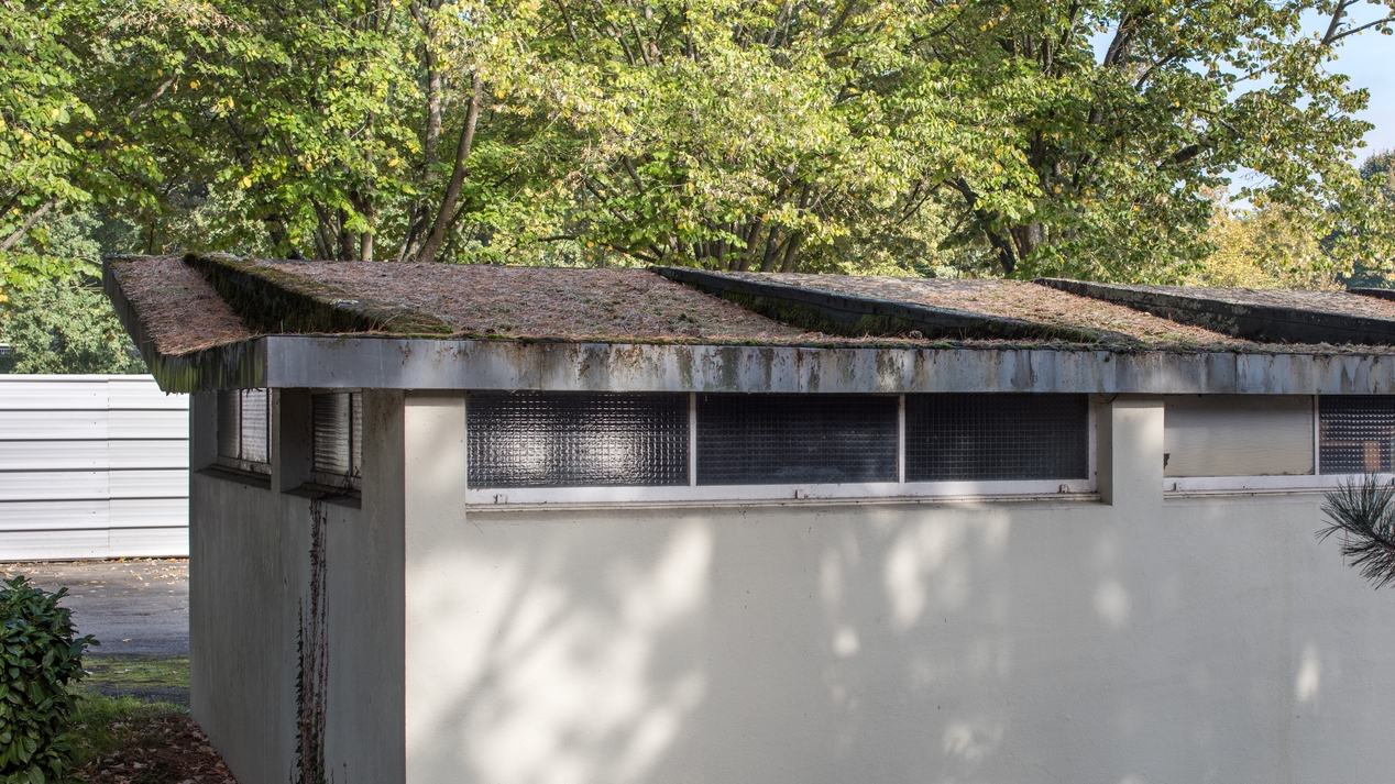 Toiture en béton armée des garages, dans le prolongement du garage à vélos.Immatriculation