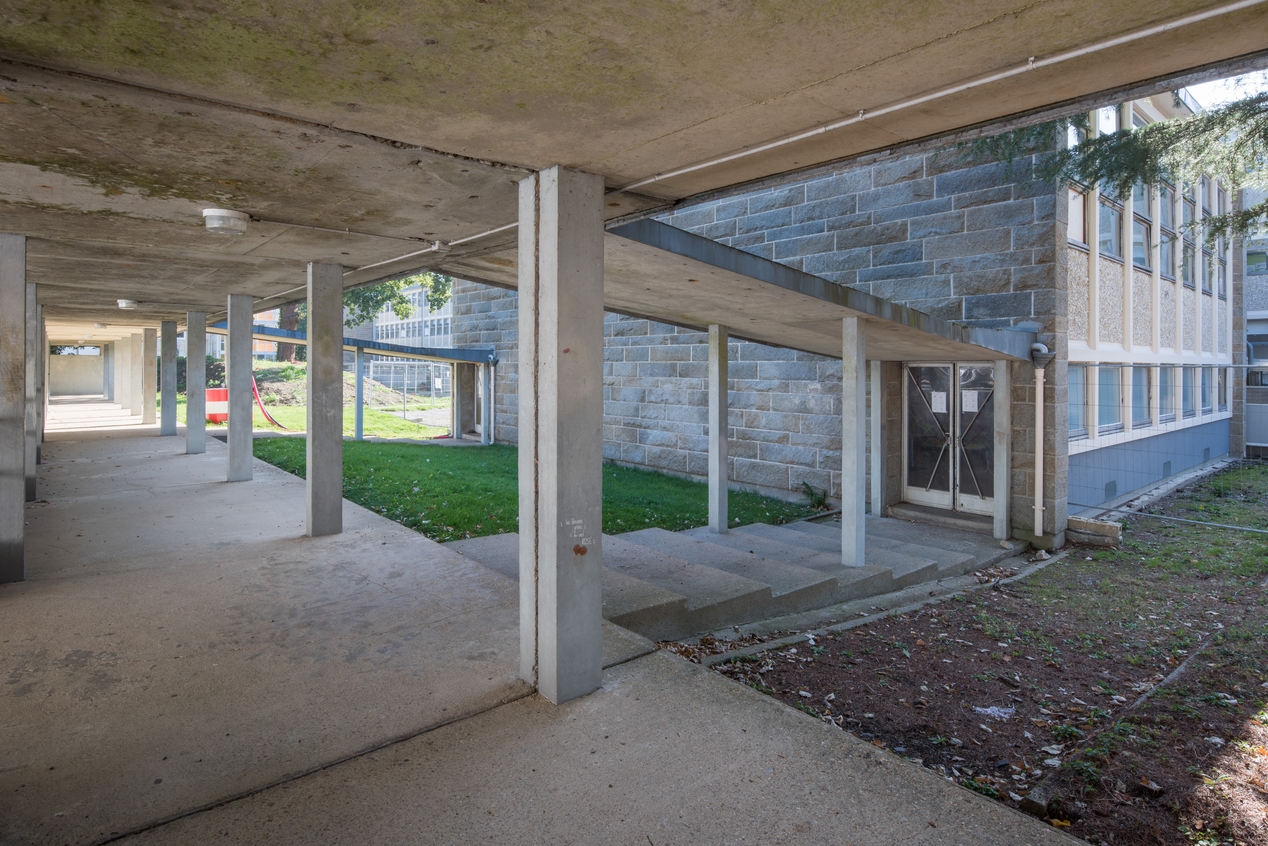 Galerie de circulation accolée au garage à vélos, et galerie de jonction avec une entrée sur la façade nord du bâtiment C (externat).Immatriculation