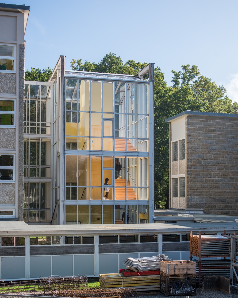 Cage d'escalier hors œuvre entre l'internat E et l'externat C. Ajout postérieur à la construction. A droite, l'escalier est du bâtiment C (externat), et ses quatre verrières en pavés de verre.Immatriculation
