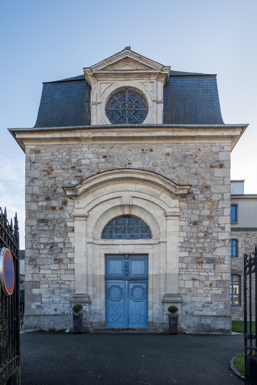La chapelle : façade nord, l'entrée et la rose.Immatriculation