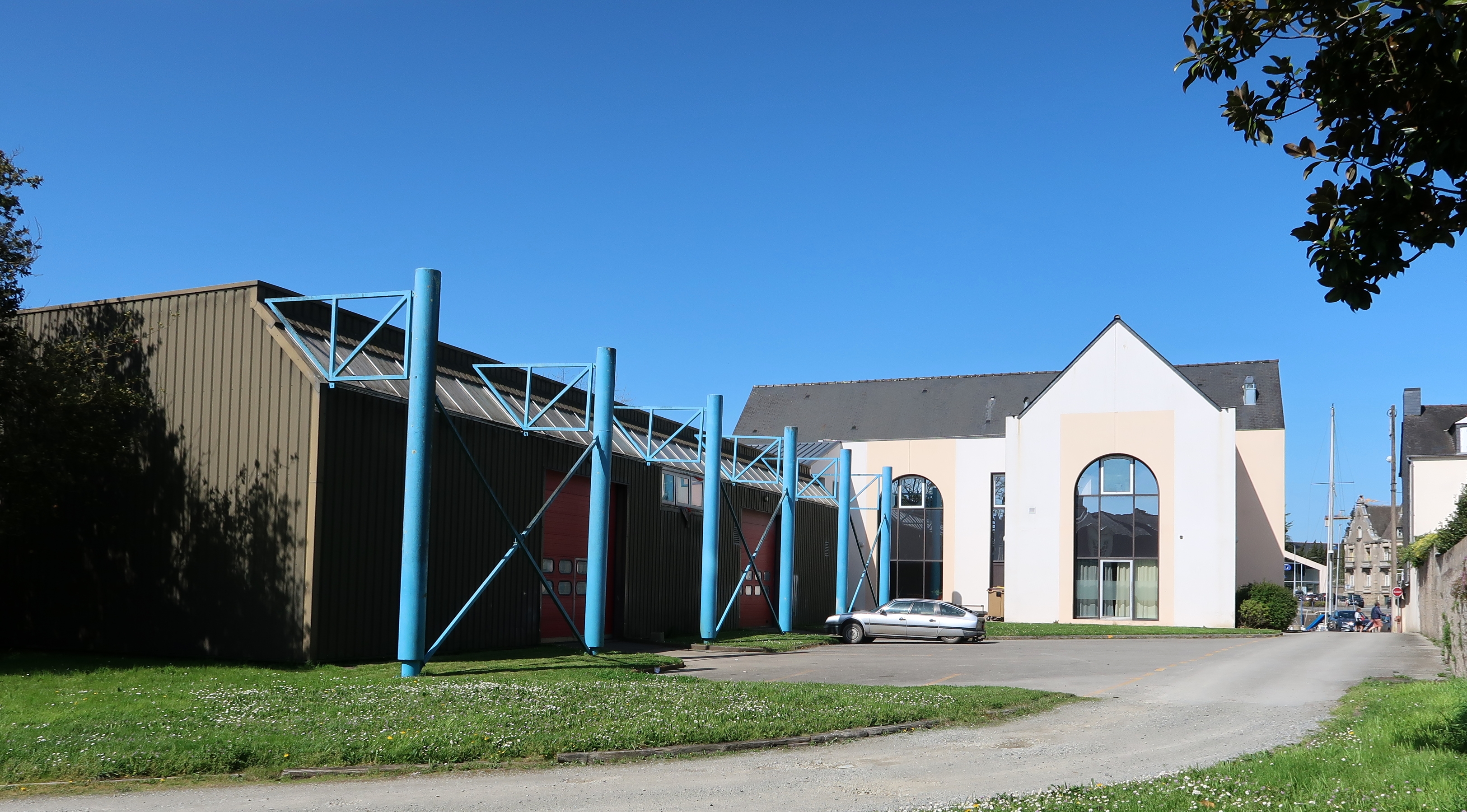 Façade latérale nord-est des ateliers carrosserie et sa structure apparente décorative. Façade arrière des ateliers commerce de l'hôtellerie, restaurant, café.Immatriculation