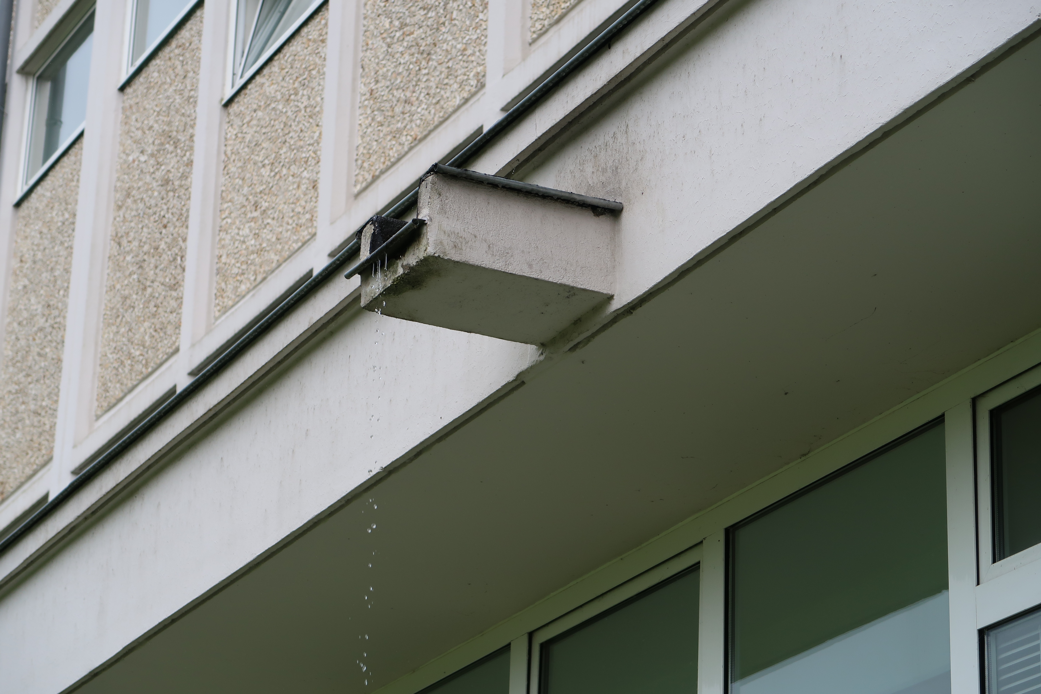 Une gargouille sur la partie en encorbellement du bâtiment D.Immatriculation