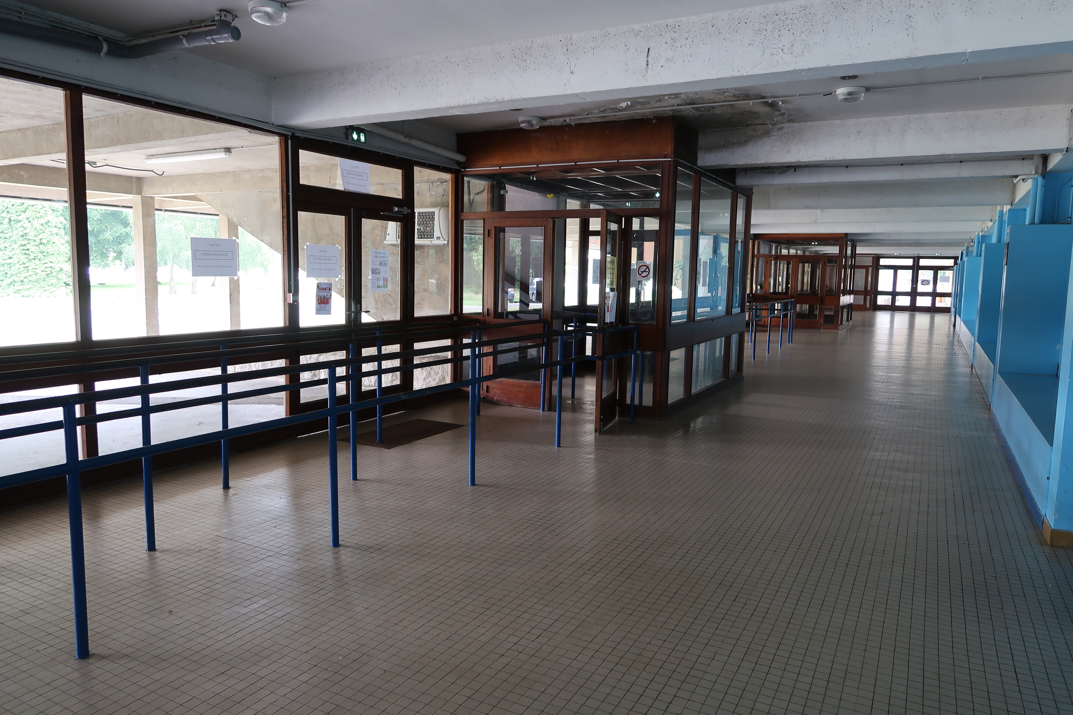 Service de restauration, vue intérieure du rez-de-chaussée : files d'attentes. A l'extérieur, les pilotis en béton.Immatriculation
