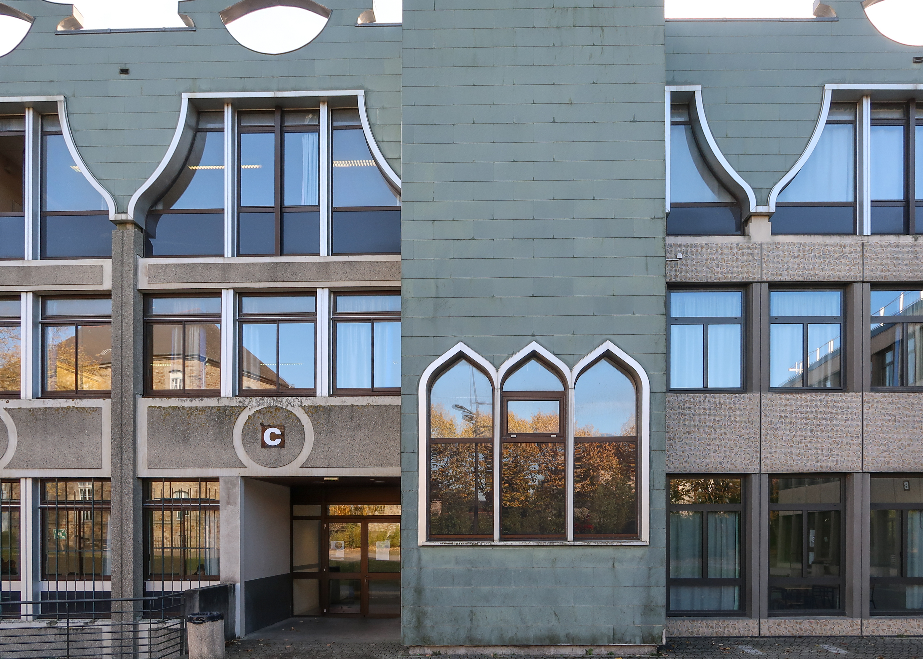 Bâtiment C, externat, Yves Moignet, architecte, 1986 : détail de la façade sur cour.Immatriculation