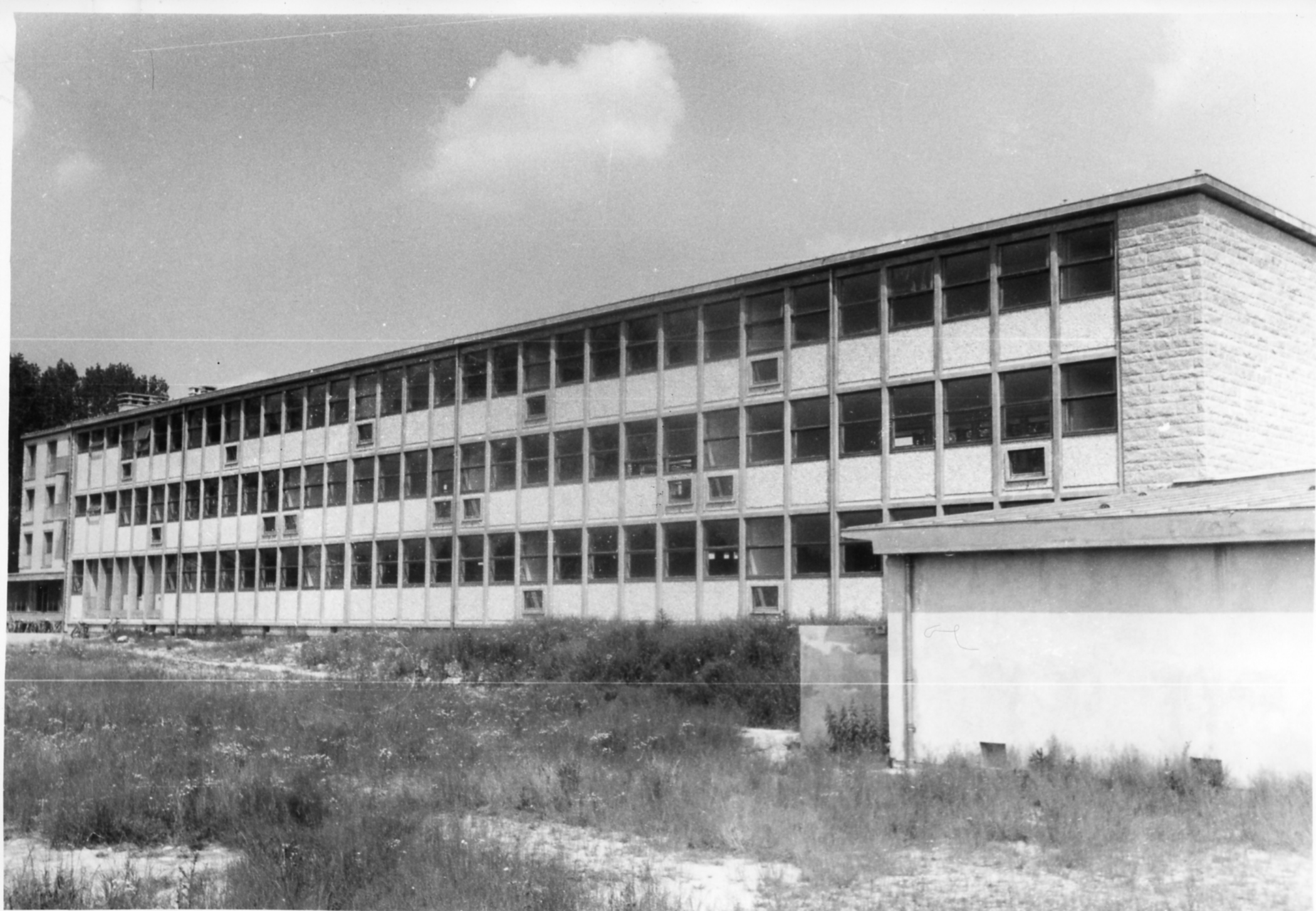 Le bâtiment B (externat et accueil), ca 1960. Au premier plan la "salle des fêtes" (dite, aujourd'hui, "polyvalente"); A l'arrière plan, le bâtiment A (administration et logements de fonction).Immatriculation