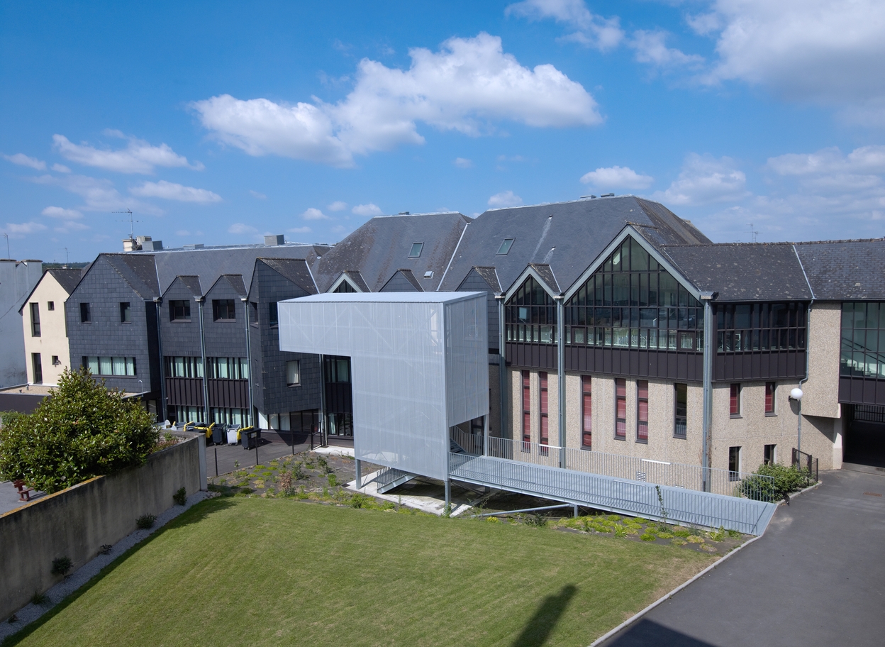 Façade sur cour du bâtiment N (septembre 1986 à septembre 1987, H. l'Hyver, architecte). La mise au norme de sécurité a conduit à l'adjonction plus récente d'un escalier métallique.Immatriculation