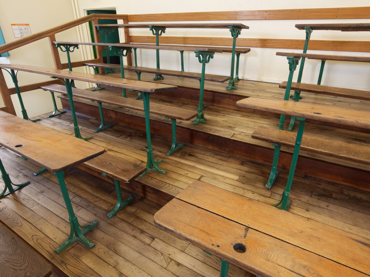 Le petit amphithéâtre (ca 1890). Vue de détail sur les estrades, les tables, les bancs.Immatriculation
