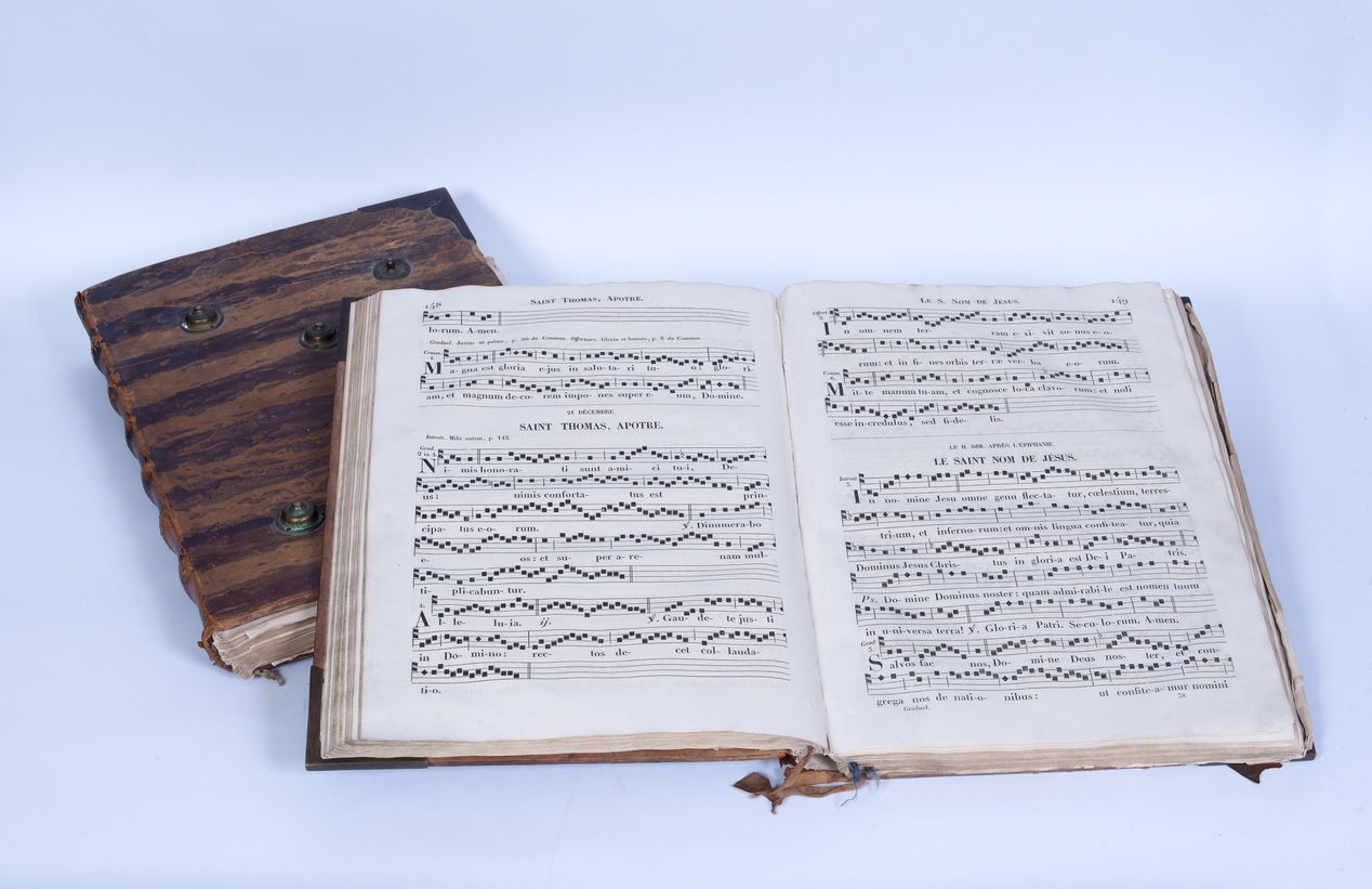 Livre de chants. Deux des ouvrages du "trésor" (bibliothèque ancienne) du lycée, qui possède une chapelle.Immatriculation