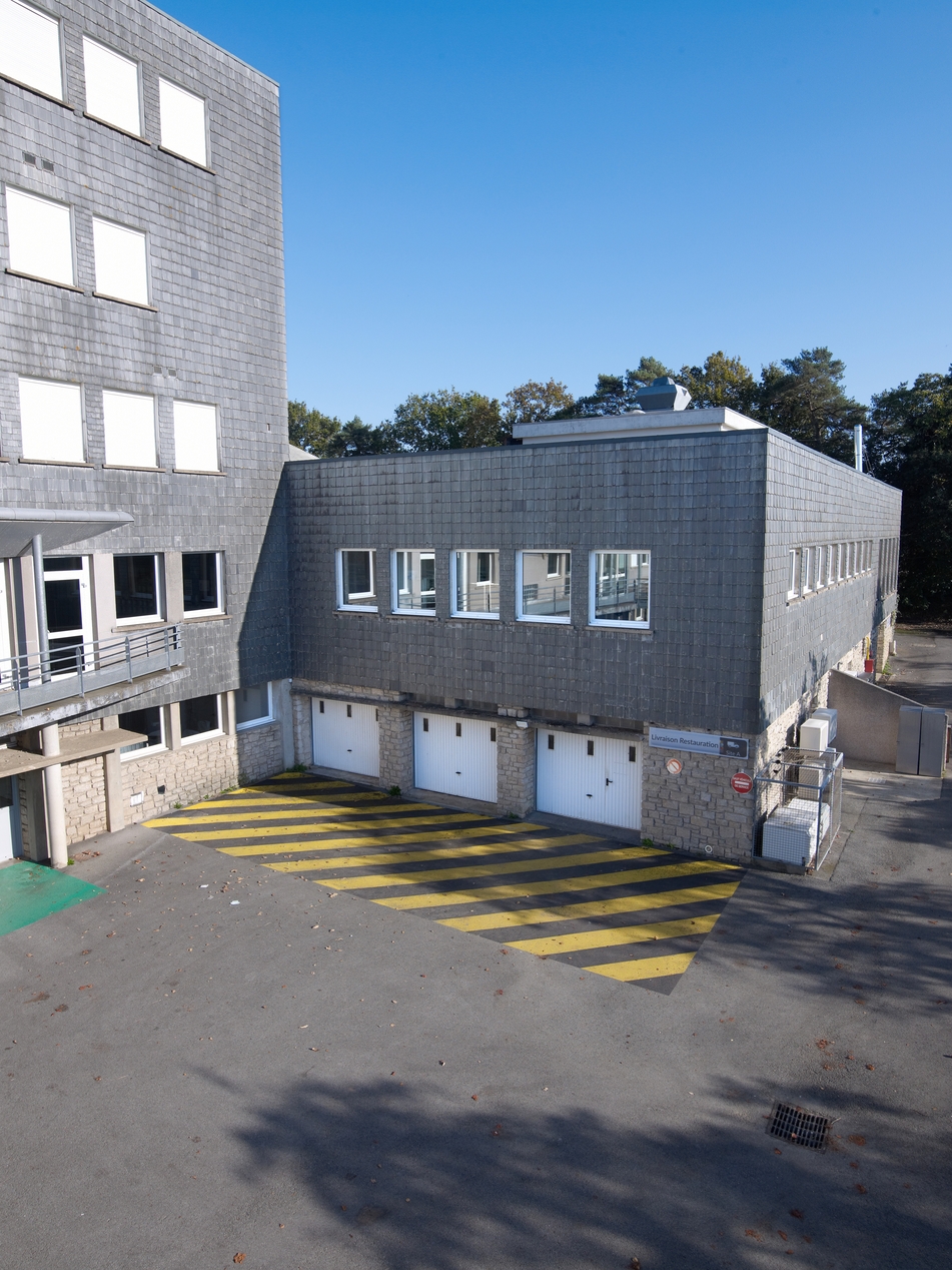 Bâtiment A, internat-restauration, détail de la façade sud-ouest (Yves Guillou architecte, 1965).Immatriculation