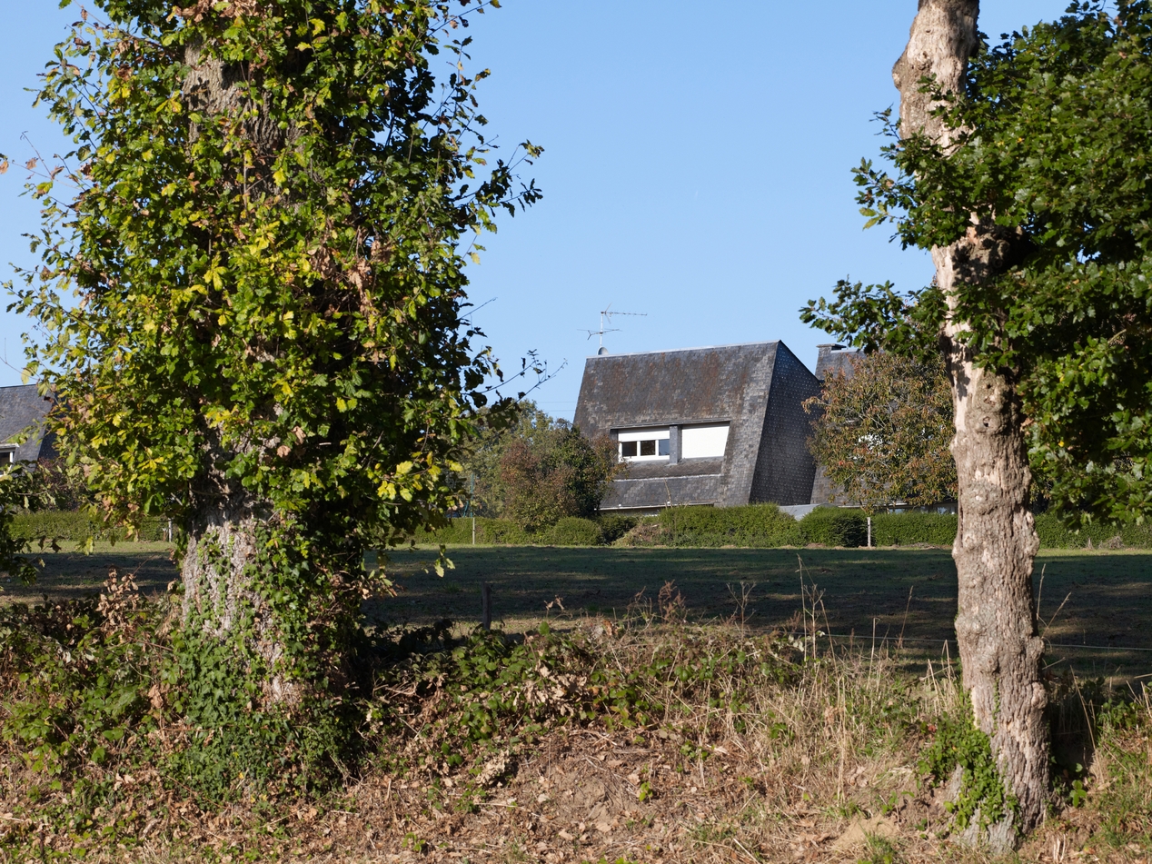 Vue de la façade sud-ouest d'un logements de fonction (Yves Guillou, architecte, 1966), dans son cadre paysager.Immatriculation