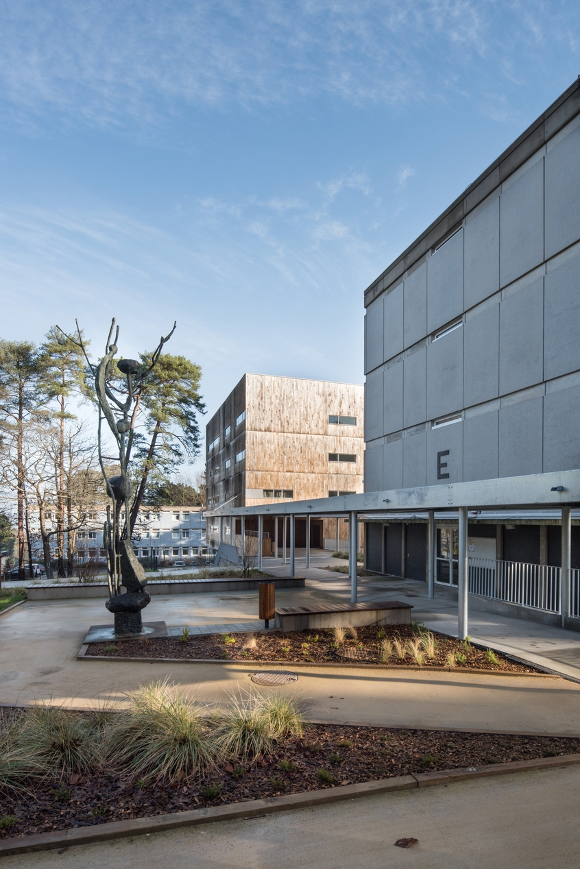 Galerie de liaison entre le nouvel internat (2018) à l'arrière plan), l'externat (E, ancien internat des filles) et le service de restauration (non visible sur la photographie).Immatriculation