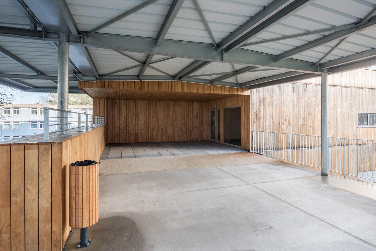Depuis la galerie de liaison entre le nouvel internat, le bâtiment E et le service de restauration, l'entrée du nouvel internat se situe au 1er étage, pour s'adapter à la déclivité du terrain.Immatriculation