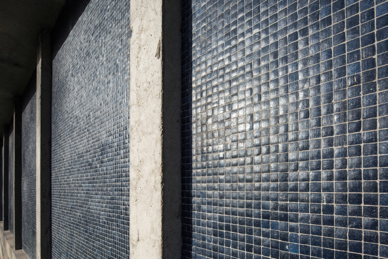 Détail de la modénature, poteaux de béton brut et panneaux de béton recouverts de mosaïques de grès : bâtiment E (externat, ancien internat des filles), pignon sud-est.Immatriculation