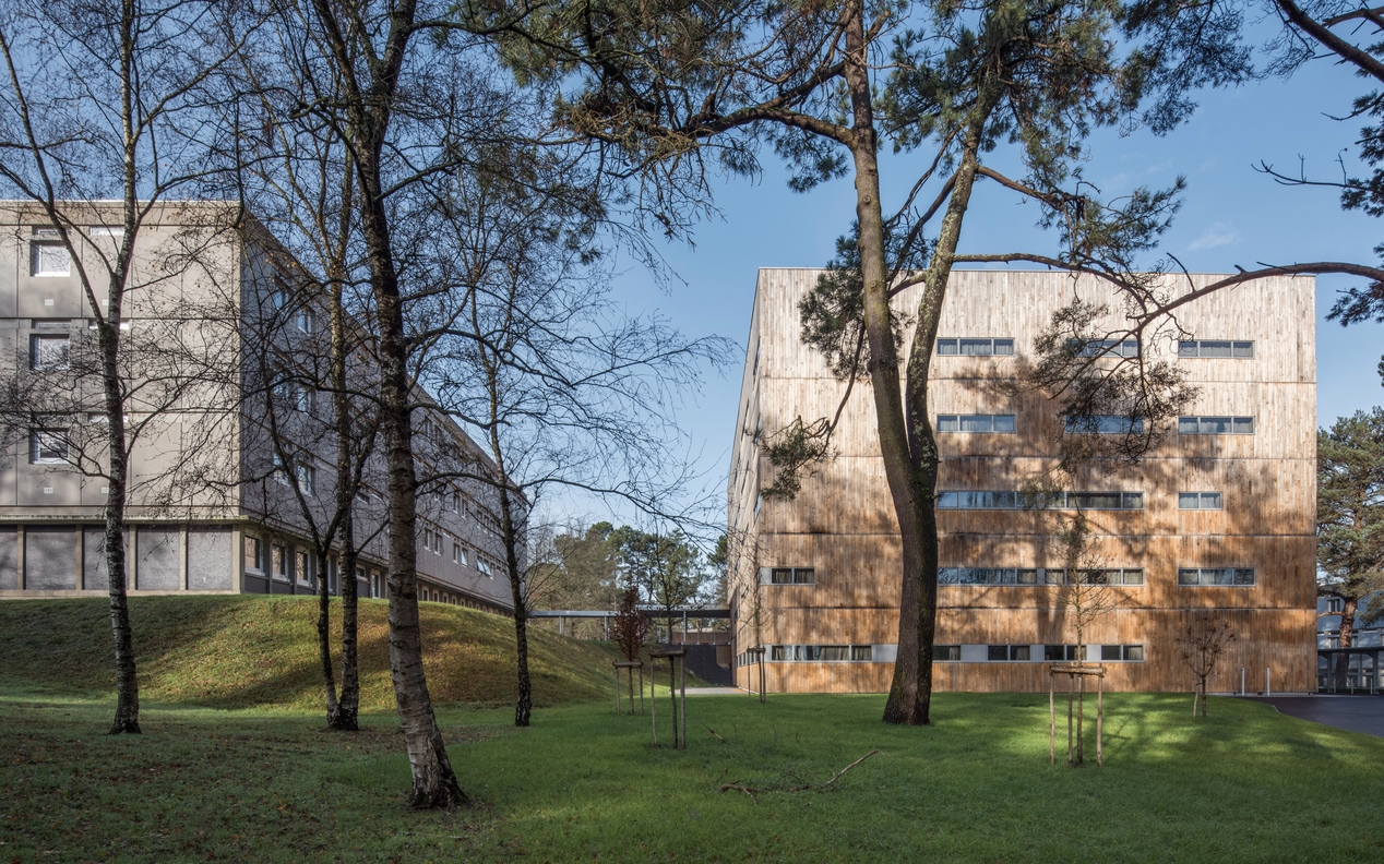 Bâtiment E et nouvel internat, pignons sur-est. Par ses volumes et le choix des matériaux, le nouvel internat s'intègre particulièrement bien au parc et au bâti existant.Immatriculation