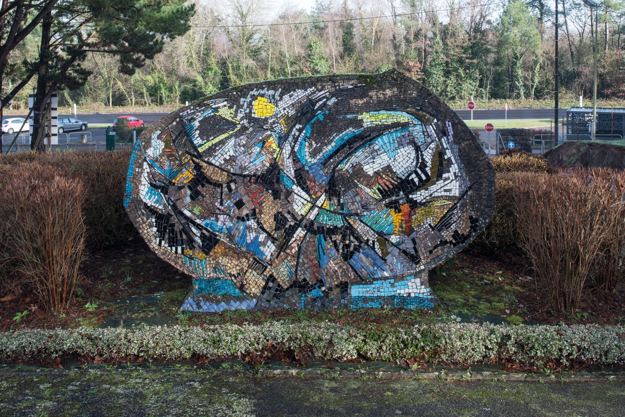 "Les Murmures de la forêt", sculpture en béton et mosaïque de Roger Lersy (1% artistique, 1975). Vue prise du sud-ouest.Immatriculation