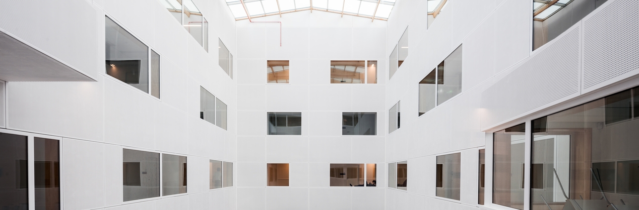 Péristyle de l'internat (David Cras, architecte, 2018) : détail sur les façades intérieures et les baies des couloirs des étages.Immatriculation