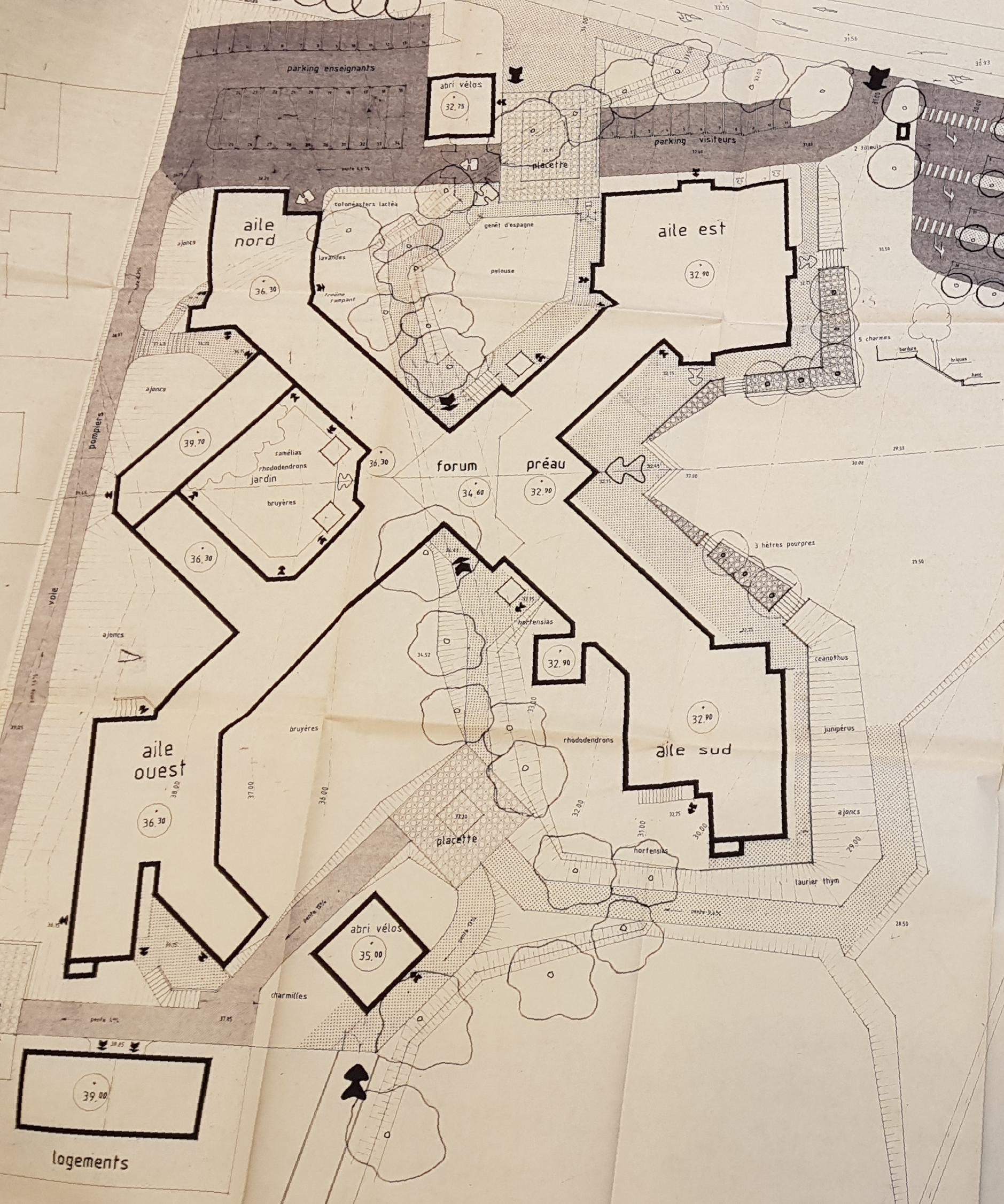 Plan masse. Espaces verts. Voirie nivellement : détail sur les bâtiments. Patrick Pincemaille, architecte, 1986.Immatriculation