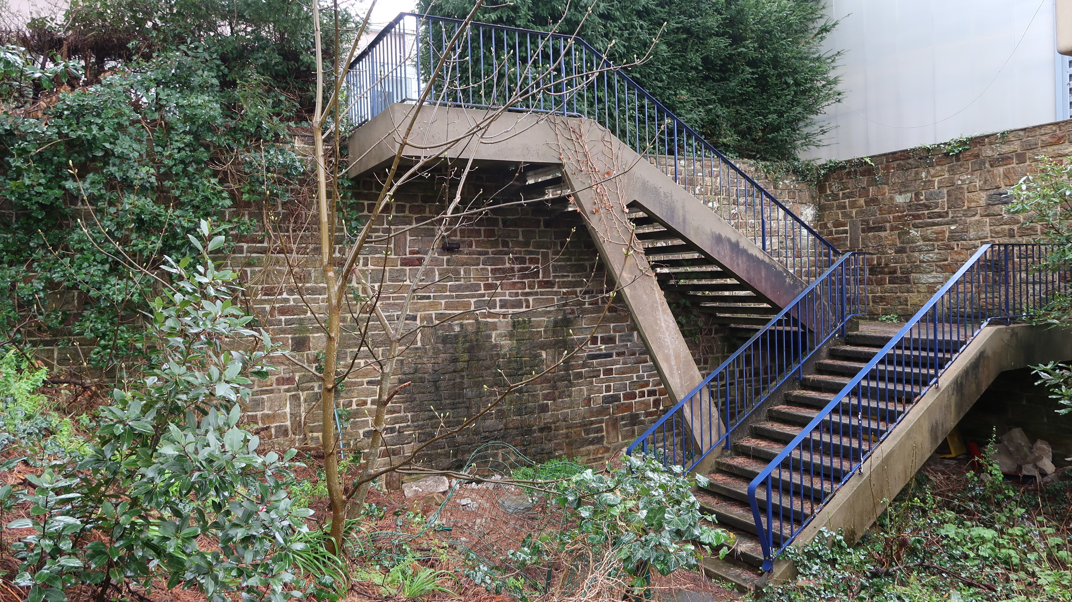 Escalier d'accès aux logements de fonction situés au sud de la parcelle.Immatriculation
