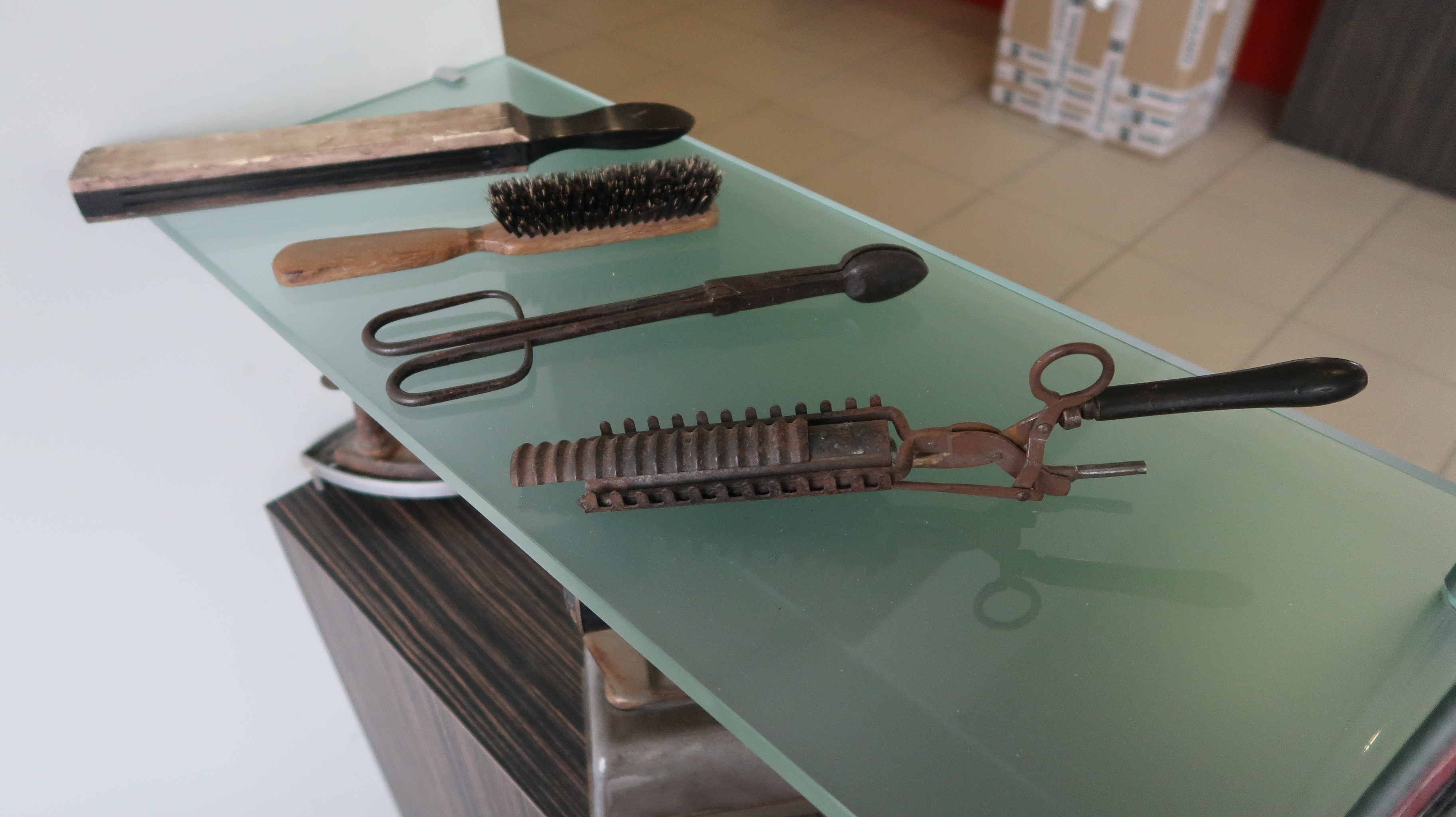 Éléments de collections pédagogiques liés à l'enseignement de la coiffure : fer, ciseaux, brosse, cuir à rasoir, exposés dans l'accueil du lycée.Immatriculation
