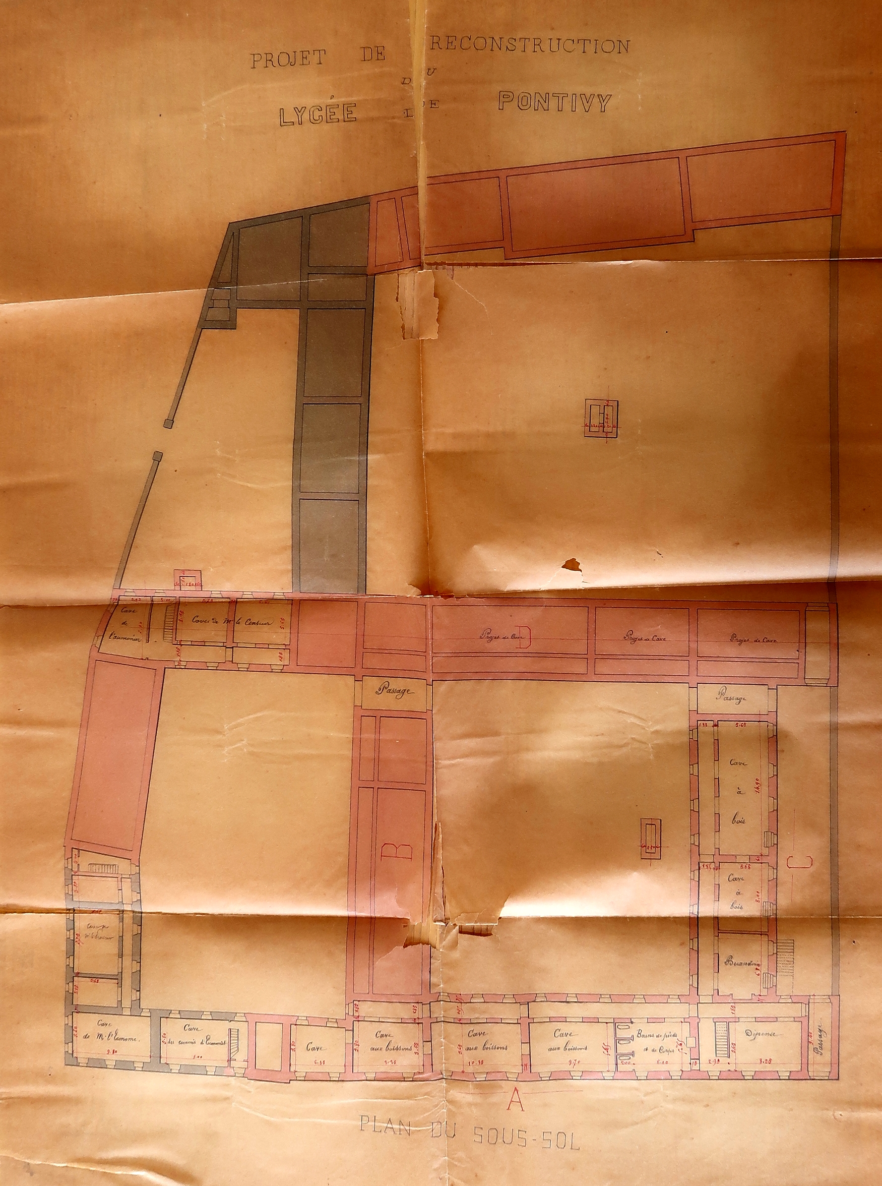 Projet de reconstruction du lycée de Pontivy, plan des caves. A noter, l'une d'elle est réservée aux "bains de pieds et de corps".Immatriculation