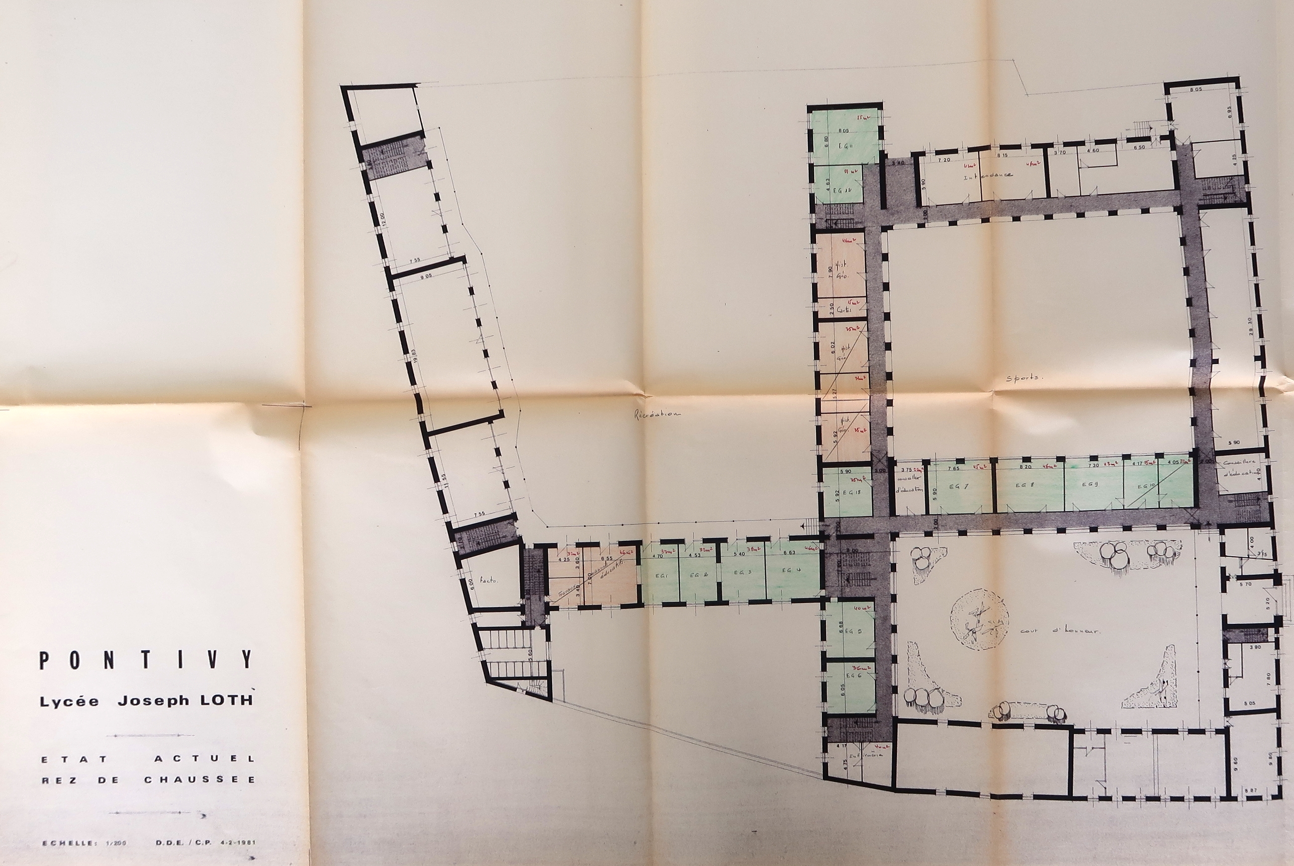 Plan du rez-de-chaussée, dressé par la DDE (Service des Construction et Équipements des Collectivités), le 4/02/1981, "les plans anciens s'averrant inexacts" (J. Berrehar, ingénieur des travaux publics de l’État).Immatriculation