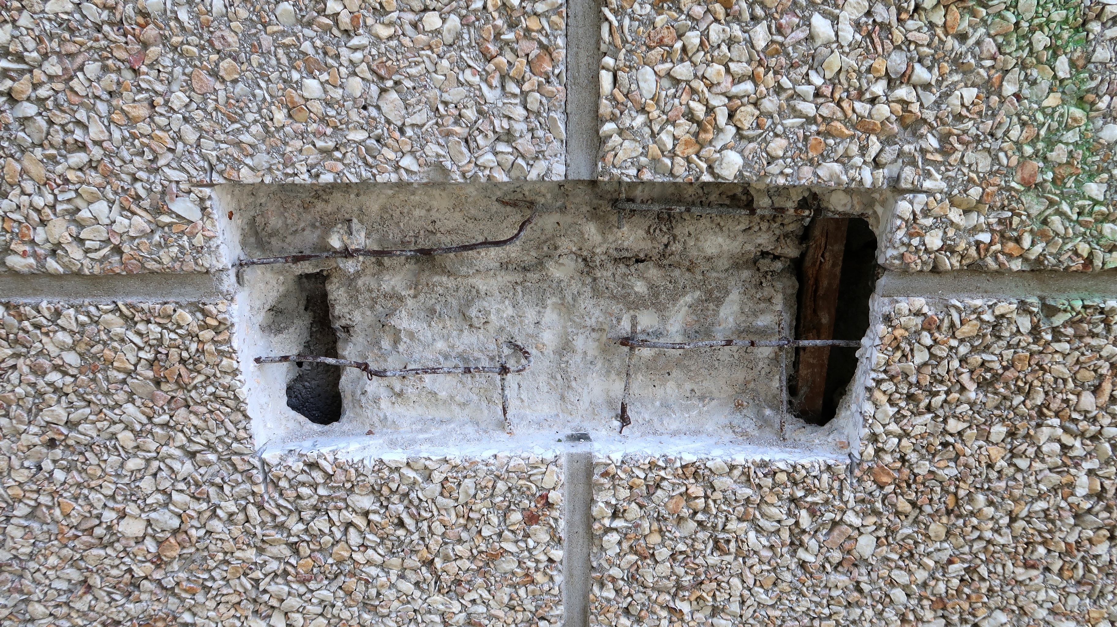 Système d'accrochage des panneaux de parement de façade, préfabriqués, en béton et gravier lavé. On aperçoit la structure (poteau en béton armé) et les parpaings en ciment utilisés pour le remplissage entre deux poteaux de la trame.Immatriculation