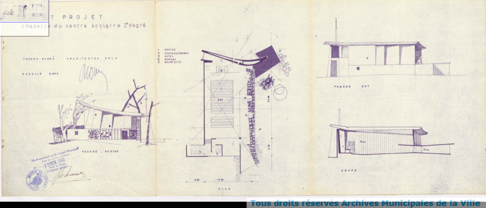 Élévations du projet de chapelle pour le lycée (R. Ouvré architecte, 19.11.1960) : la chapelle réalisée est moins "ambitieuse" pour des raisons de coût.Immatriculation